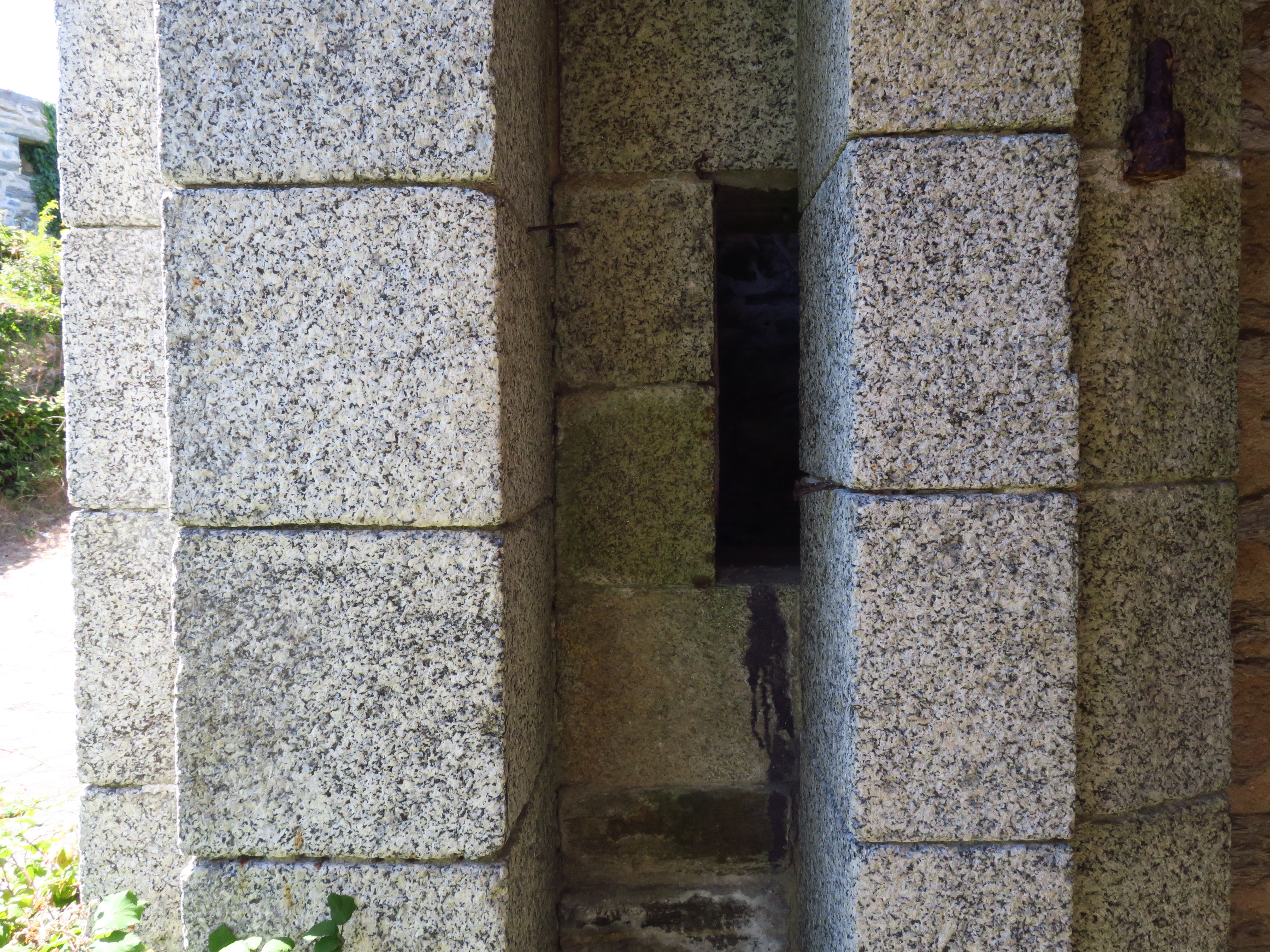 Groix, batterie du Bas-Grognon, corps de garde crénelé, créneau de défense de la porte.Immatriculation