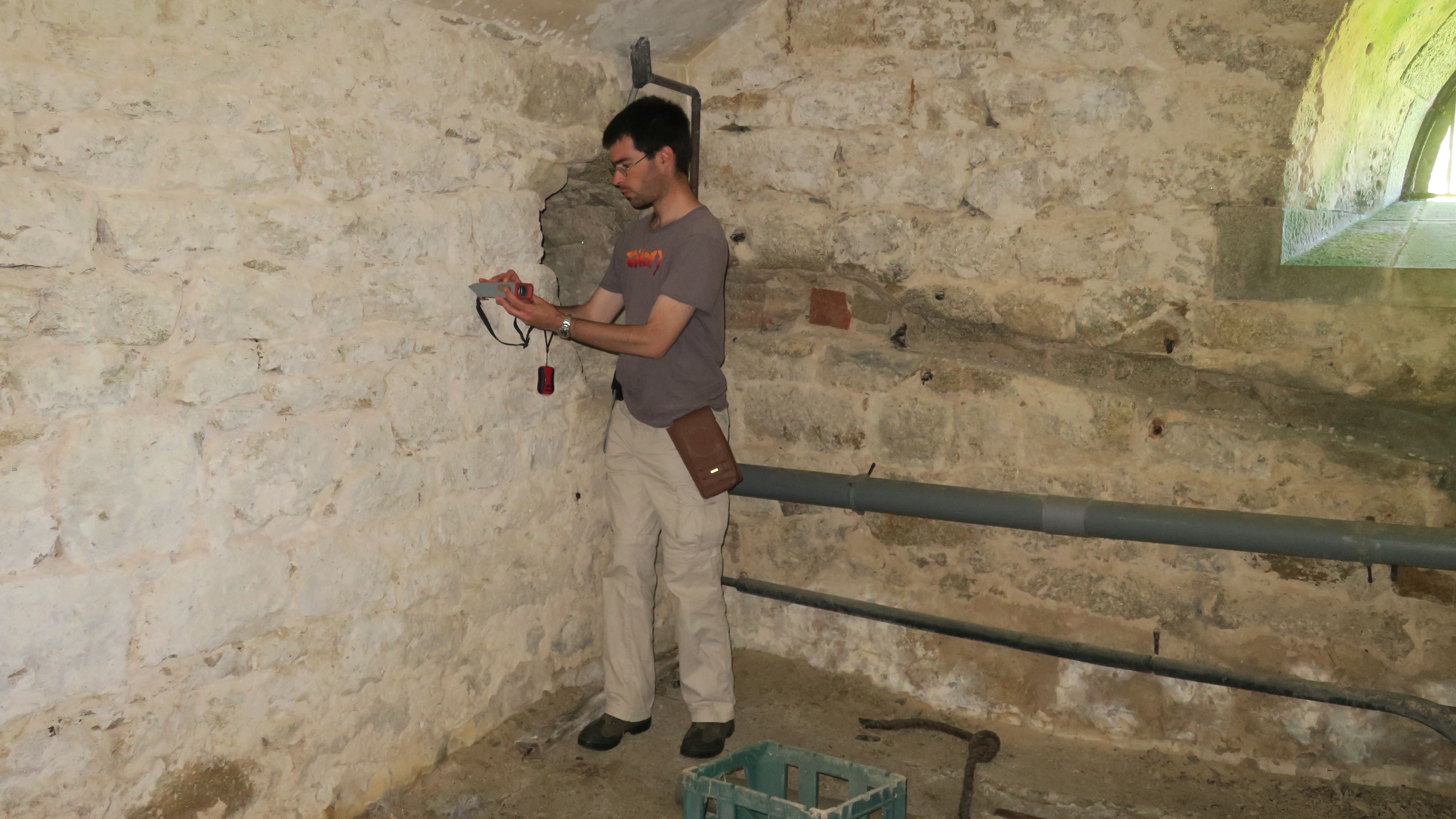 Hoedic, fort central, caserne à l'épreuve, prise de mesures par Patrick Jadé dans les casemates du sous-sol, juillet 2016.Immatriculation