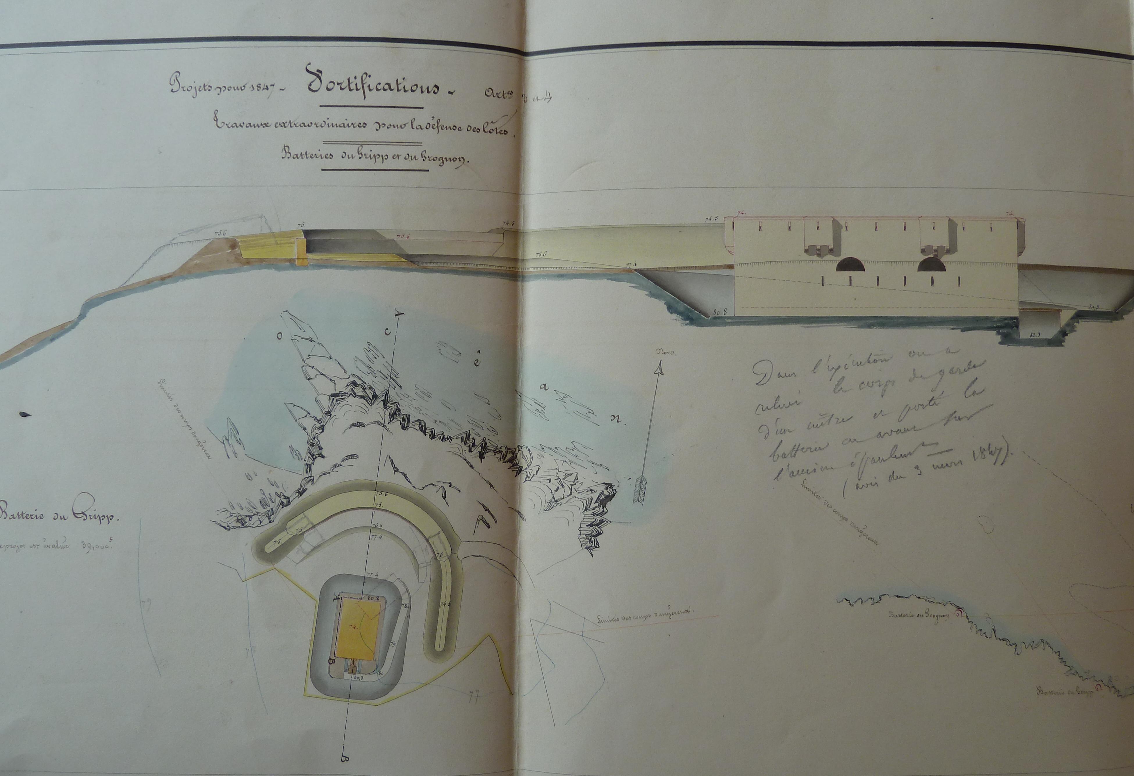 Service historique de la Défense, département Armée de Terre, Vincennes. Archives du Génie ; Article 8, Places françaises et d'Algérie : 1 VH 1474, Place de Port-Louis, projets et dépenses annuels, 1847-1856. Direction du Génie de Nantes, Place de Port-Louis, feuille n° 8 des projets pour 1848, travaux extraordinaires pour la défense des côtes, batteries du Gripp et du Grognon, 22 novembre 1846.