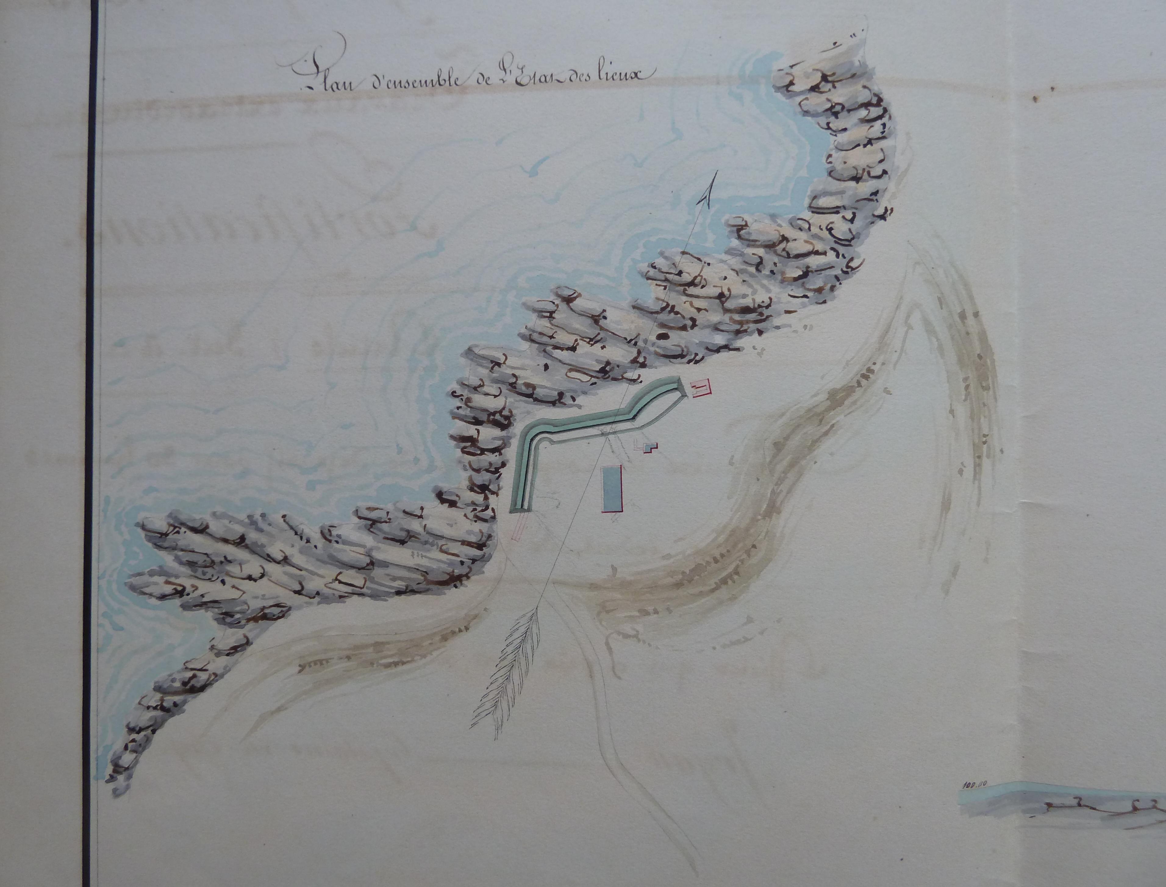 Service historique de la Défense, département Armée de Terre, Vincennes. Archives du Génie ; Article 8, Places françaises et d'Algérie : 1 VH 1473, Place de Port-Louis, projets et dépenses annuels, 1835-1846. Direction du Génie de Nantes, Place de Port-Louis, feuille n° 6 des projets extraordinaires pour 1845, construire un corps de garde défensif pour 30 hommes pour réduit de la batterie de Grippe, 28 décembre 1845.