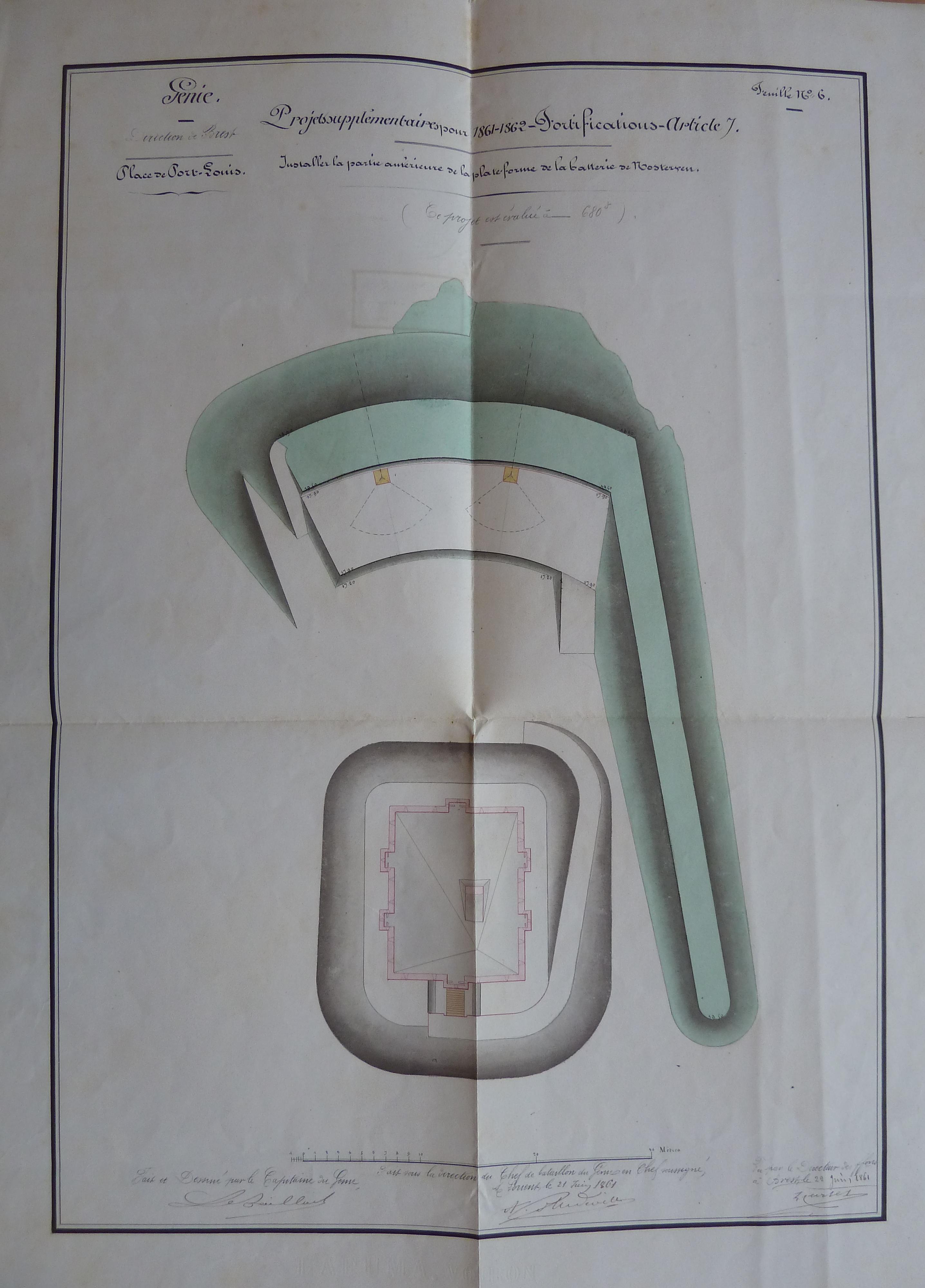 Service historique de la Défense, département Armée de Terre, Vincennes. Archives du Génie ; Article 8, Places françaises et d'Algérie : 1 VH 1475, Place de Port-Louis, projets et dépenses annuels, 1857-1875. Direction du Génie de Brest, Place de Port-Louis, feuille n° 6 des projets supplémentaires pour 1861-1862, installer la partie antérieure de la plateforme de la batterie de Nosterven, 21 juin 1861.