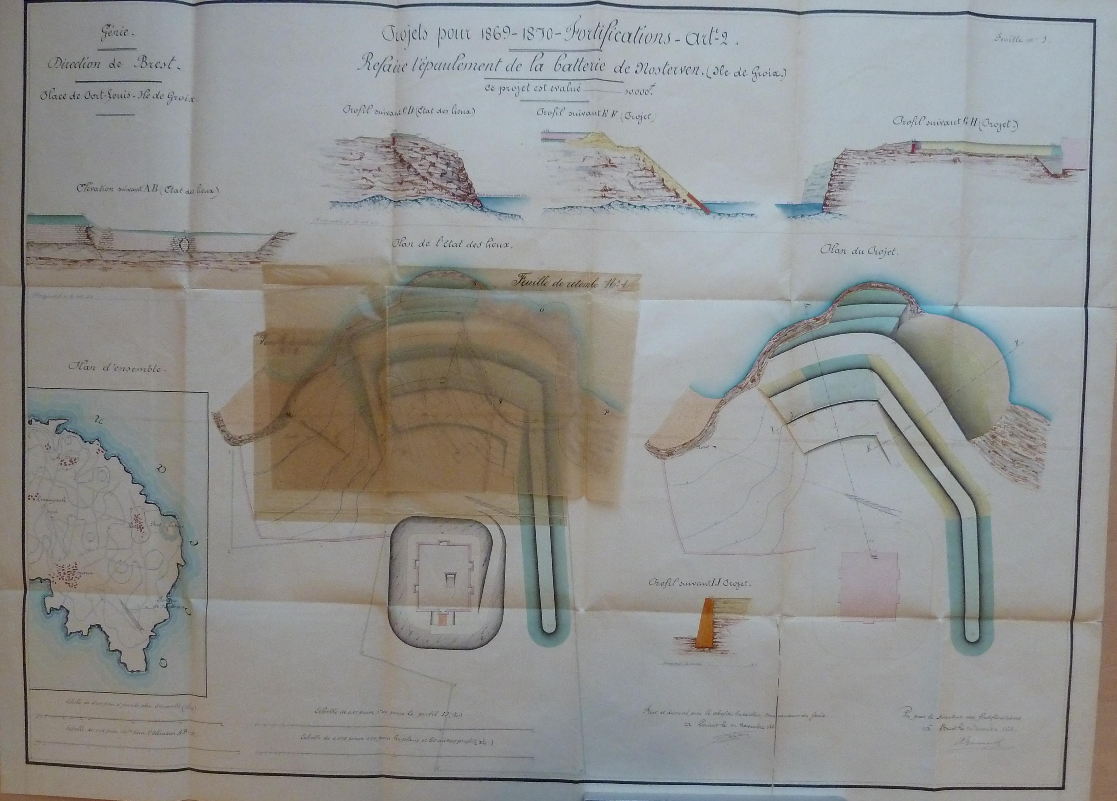 Service historique de la Défense, département Armée de Terre, Vincennes. Archives du Génie ; Article 8, Places françaises et d'Algérie : 1 VH 1475, Place de Port-Louis, projets et dépenses annuels, 1857-1875. Direction du Génie de Brest, Place de Port-Louis, feuille n° 1 des projets pour 1869-1870, refaire l'épaulement de la batterie de Nosterven, 30 novembre 1868.