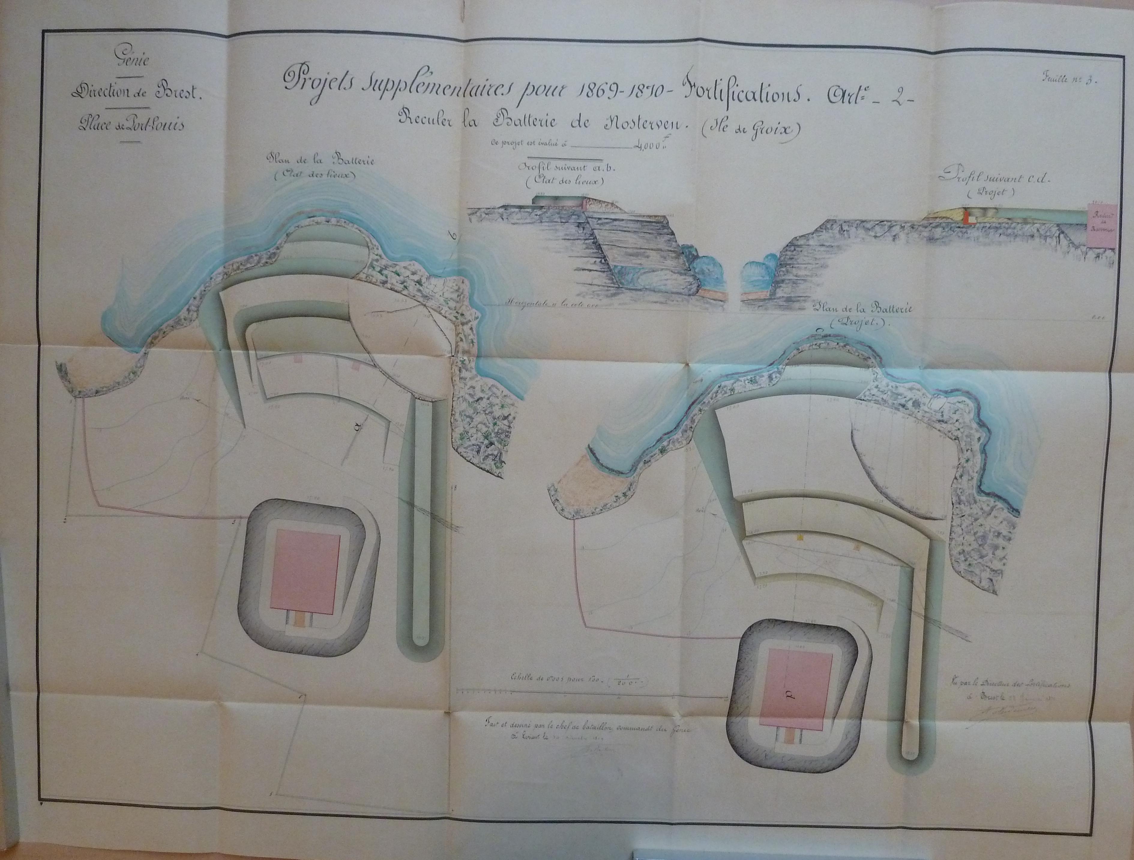 Service historique de la Défense, département Armée de Terre, Vincennes. Archives du Génie ; Article 8, Places françaises et d'Algérie : 1 VH 1475, Place de Port-Louis, projets et dépenses annuels, 1857-1875. Direction du Génie de Brest, Place de Port-Louis, feuille n° 3 des projets supplémentaires pour 1869-1870, reculer la batterie de Nosterven, 30 novembre 1869.