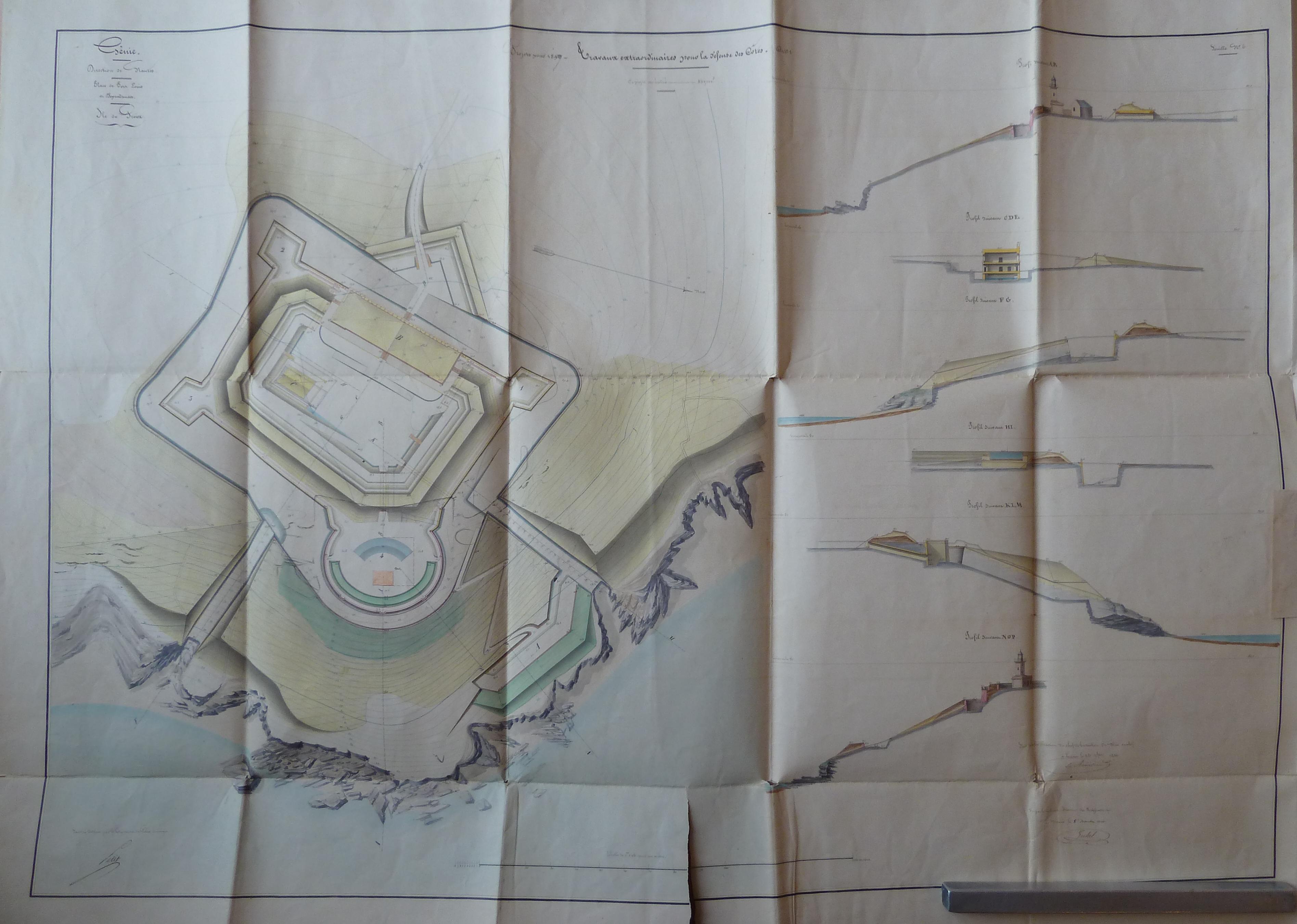 Service historique de la Défense, département Armée de Terre, Vincennes. Archives du Génie ; Article 8, Places françaises et d'Algérie : 1 VH 1474, Place de Port-Louis, projets et dépenses annuels, 1847-1856. Direction du Génie de Nantes, Place de Port-Louis, feuille n° 6 des projets pour 1847, travaux extraordinaires pour la défense des côtes, 22 novembre 1846.