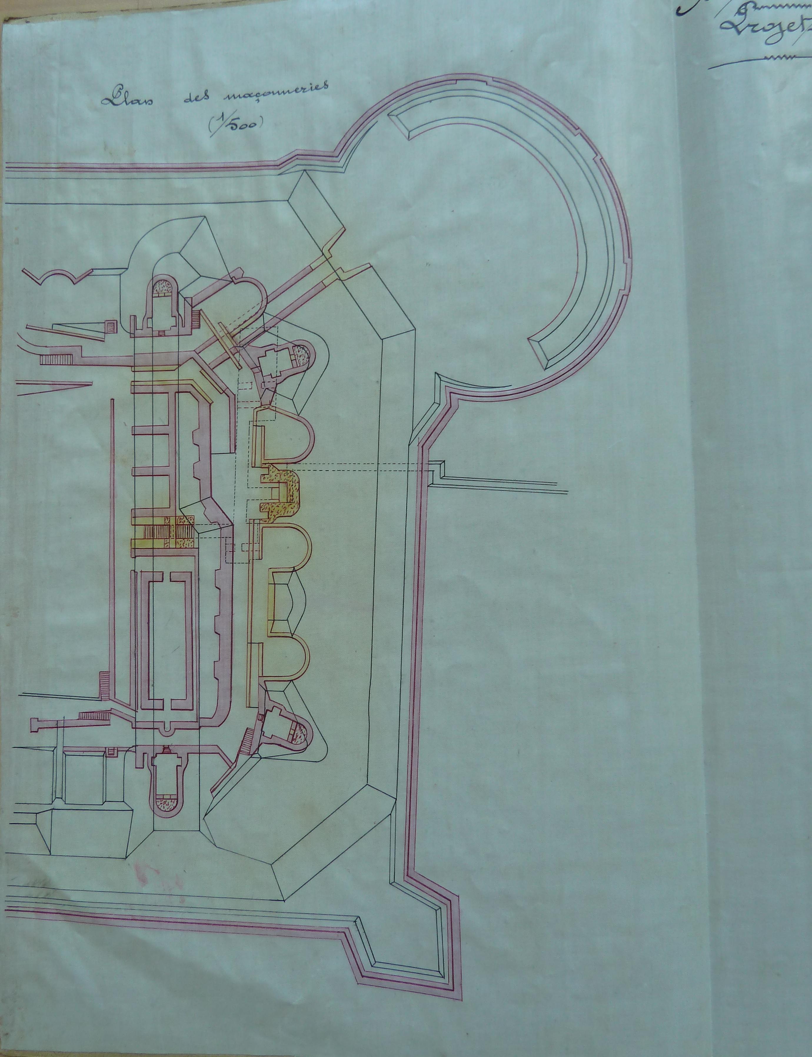Service historique de la Défense, Département Armée de Terre, Vincennes. Archives de la Guerre, Troisième République ; Sous-série 7 N, État-major de l'Armée : 7 N 1905, Défense des fronts de mer, dossiers de l’inspection générale permanente d’armement des côtes - Atlantique : pièces collectives, Fort Médoc, Fort Paté, La Rochelle, embouchure de la Loire, Lorient, Nantes, Quiberon, Rochefort, Îles d’Aix et d’Oléron, Saint-Nazaire (1878-1898), Îles de Groix, d’Ouessant et de Ré (1887-1907). Croquis joint au procès-verbal de conférence du 6 juin 1893, réorganisation du fort Surville.