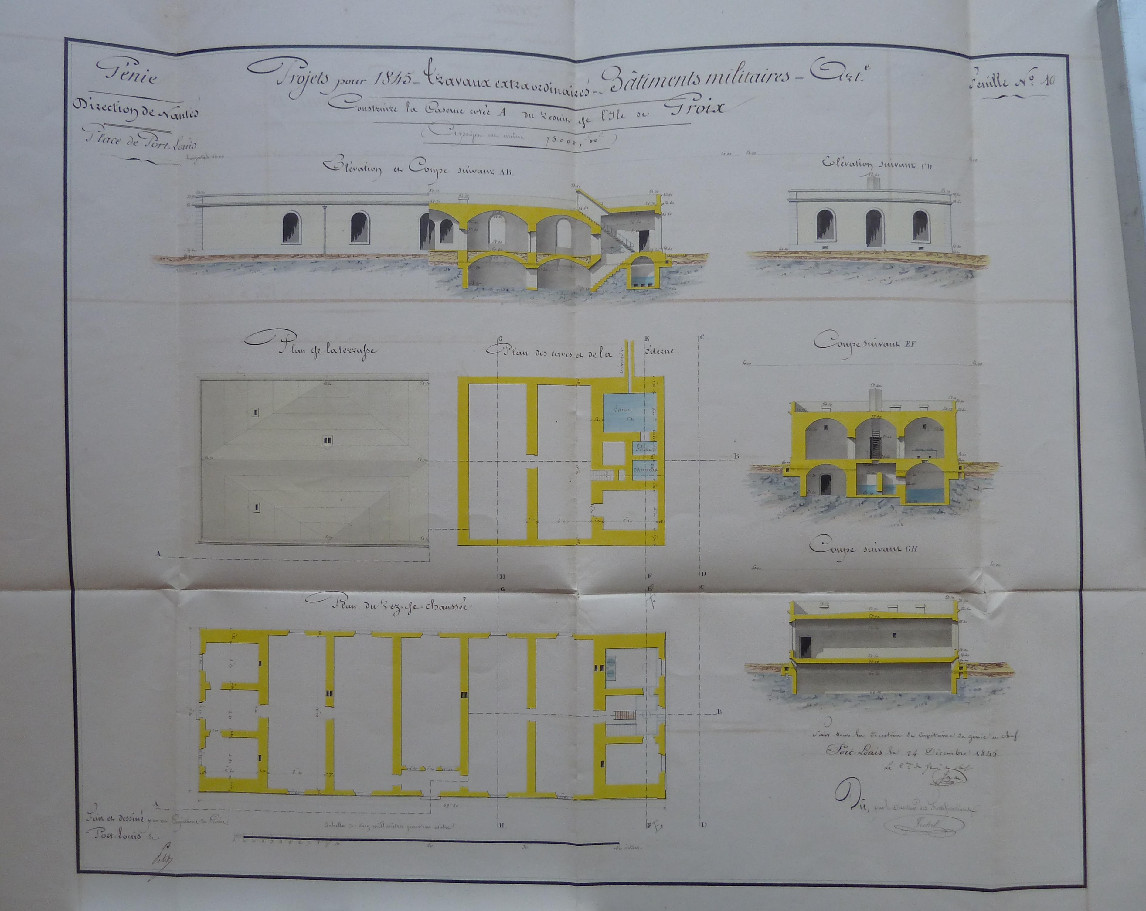 Service historique de la Défense, département Armée de Terre, Vincennes. Archives du Génie ; Article 8, Places françaises et d'Algérie : 1 VH 1473, Place de Port-Louis, projets et dépenses annuels, 1835-1846. Direction du Génie de Nantes, Place de Port-Louis, feuille n° 10 des projets extraordinaires pour 1845, construire la caserne cotée A du réduit de l'île de Groix, 24 décembre 1845.