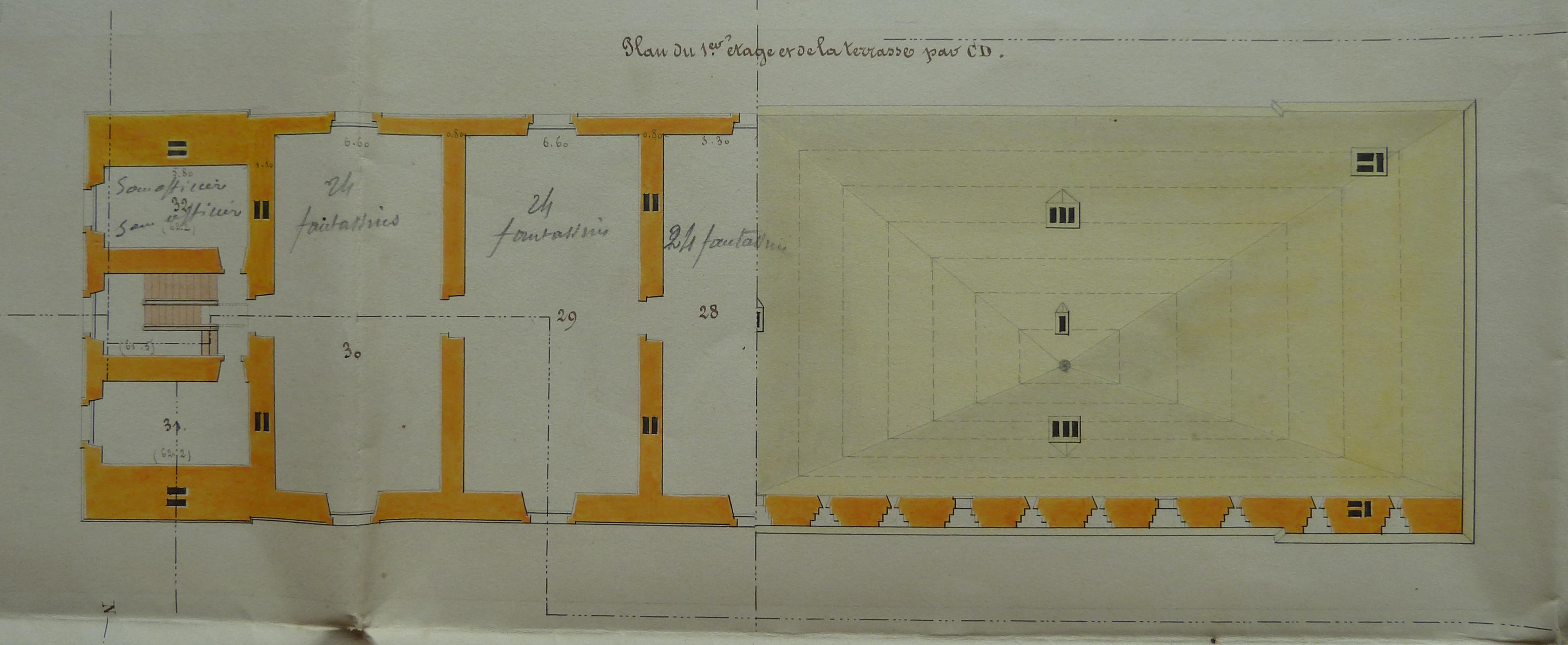 1 VH 1474. Place de Port-Louis, feuille n° 4 des projets pour 1848, travaux extraordinaires pour la défense des côtes, Ile de Groix, achèvement de la caserne du fort Lacroix, 25 décembre 1847.Immatriculation