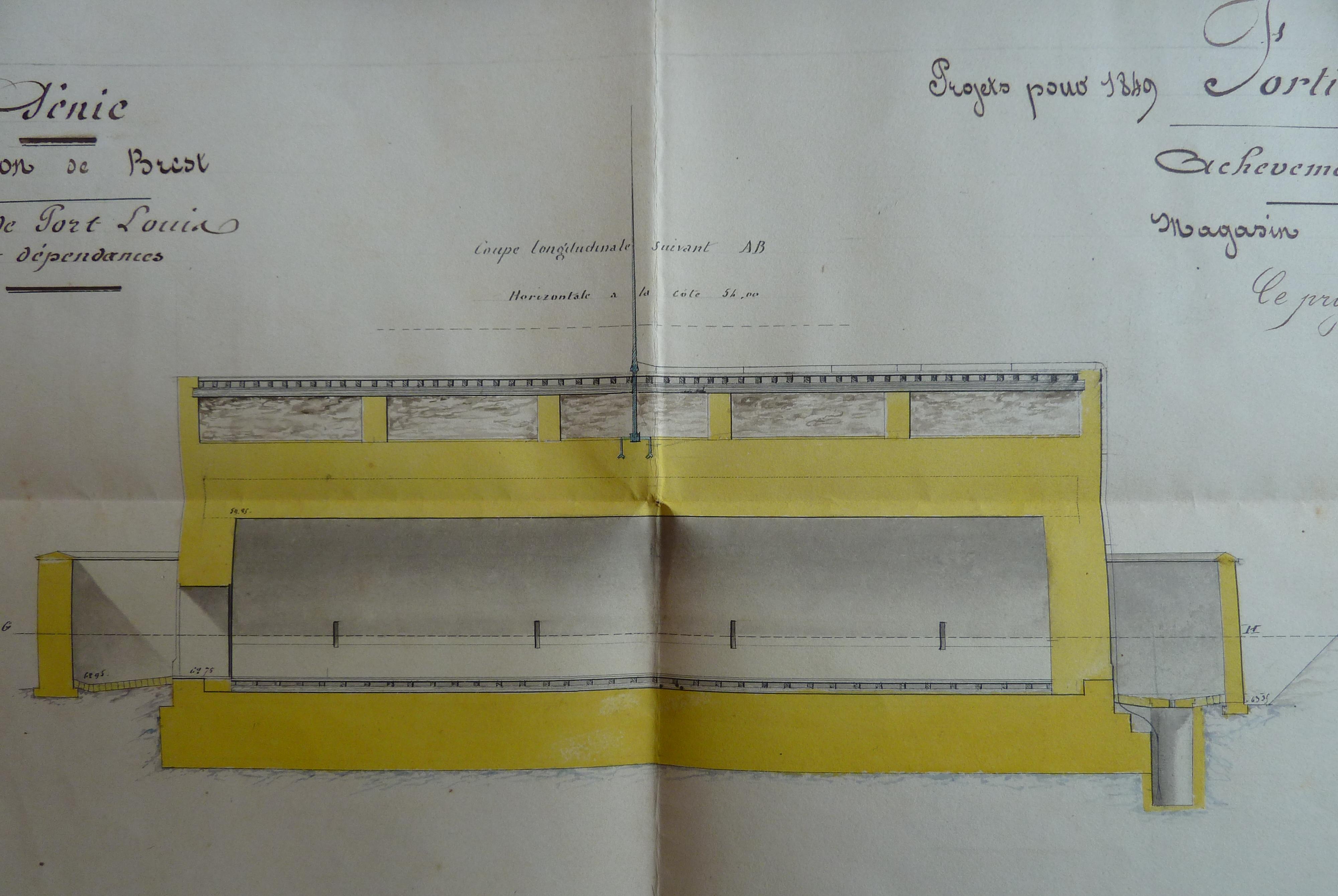 Service historique de la Défense, département Armée de Terre, Vincennes. Archives du Génie ; Article 8, Places françaises et d'Algérie : 1 VH 1474, Place de Port-Louis, projets et dépenses annuels, 1847-1856. Direction du Génie de Nantes, Place de Port-Louis, feuille n° 4 des projets pour 1849, achèvement du fort Lacroix, magasin à poudre pour 30000 kg, 17 décembre 1848.
