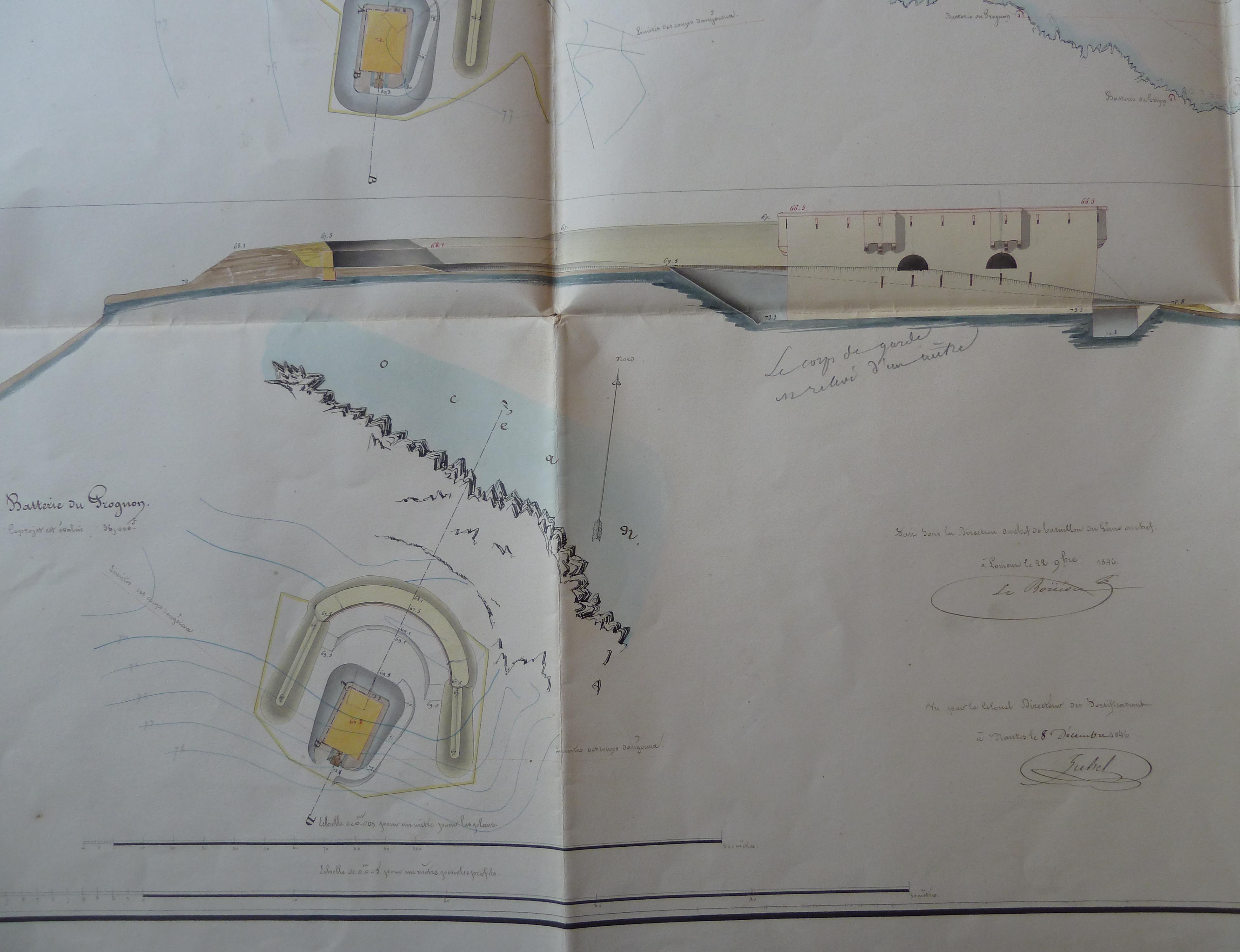 Service historique de la Défense, département Armée de Terre, Vincennes. Archives du Génie ; Article 8, Places françaises et d'Algérie : 1 VH 1474, Place de Port-Louis, projets et dépenses annuels, 1847-1856. Direction du Génie de Nantes, Place de Port-Louis, feuille n° 8 des projets pour 1848, travaux extraordinaires pour la défense des côtes, batteries du Gripp et du Grognon, 22 novembre 1846.
