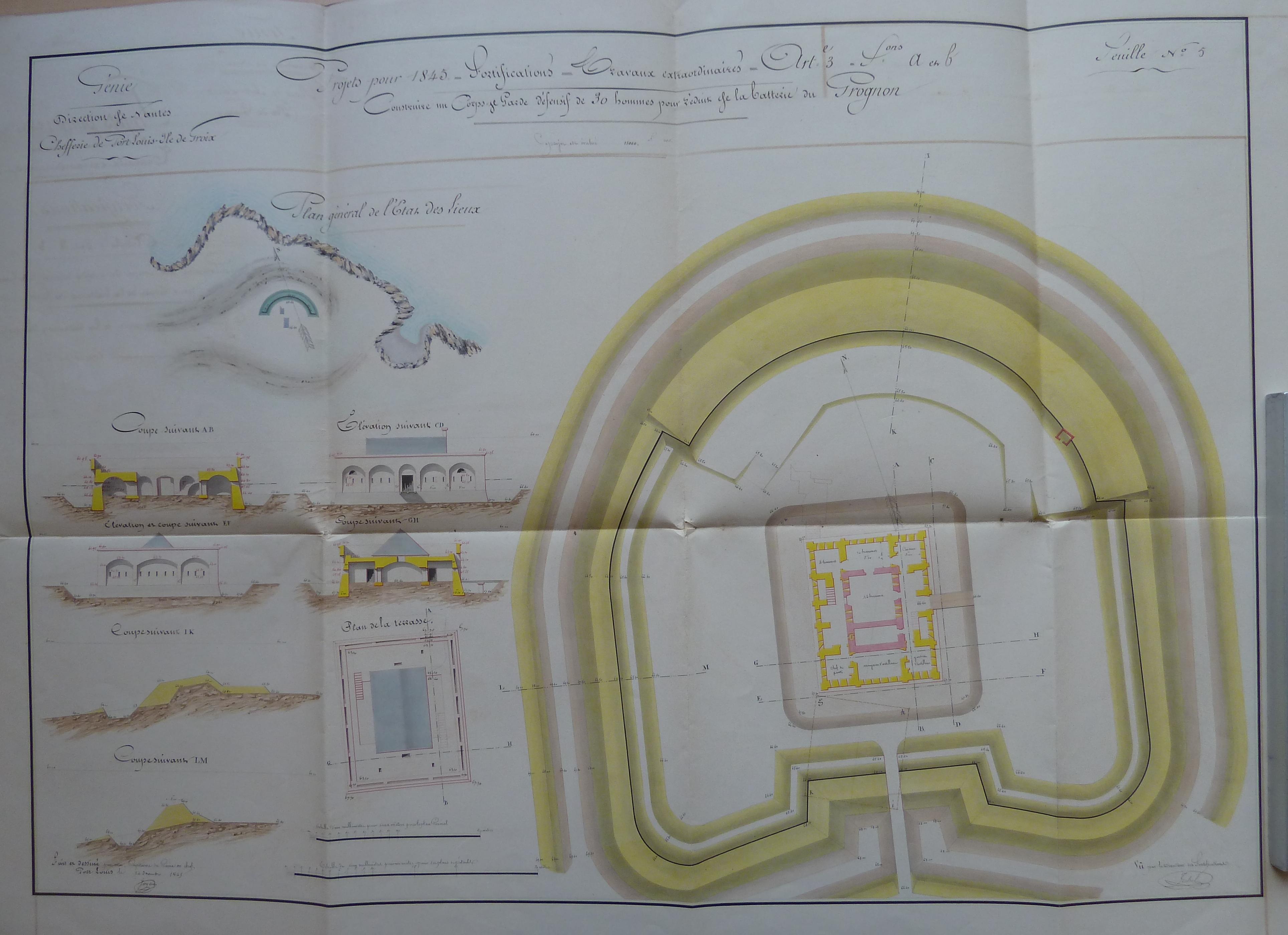 Service historique de la Défense, département Armée de Terre, Vincennes. Archives du Génie ; Article 8, Places françaises et d'Algérie : 1 VH 1473, Place de Port-Louis, projets et dépenses annuels, 1835-1846. Direction du Génie de Nantes, Place de Port-Louis, feuille n° 5 des projets extraordinaires pour 1845, construire un corps de garde défensif de 30 hommes pour réduit de la batterie du Grognon, 24 décembre 1845.