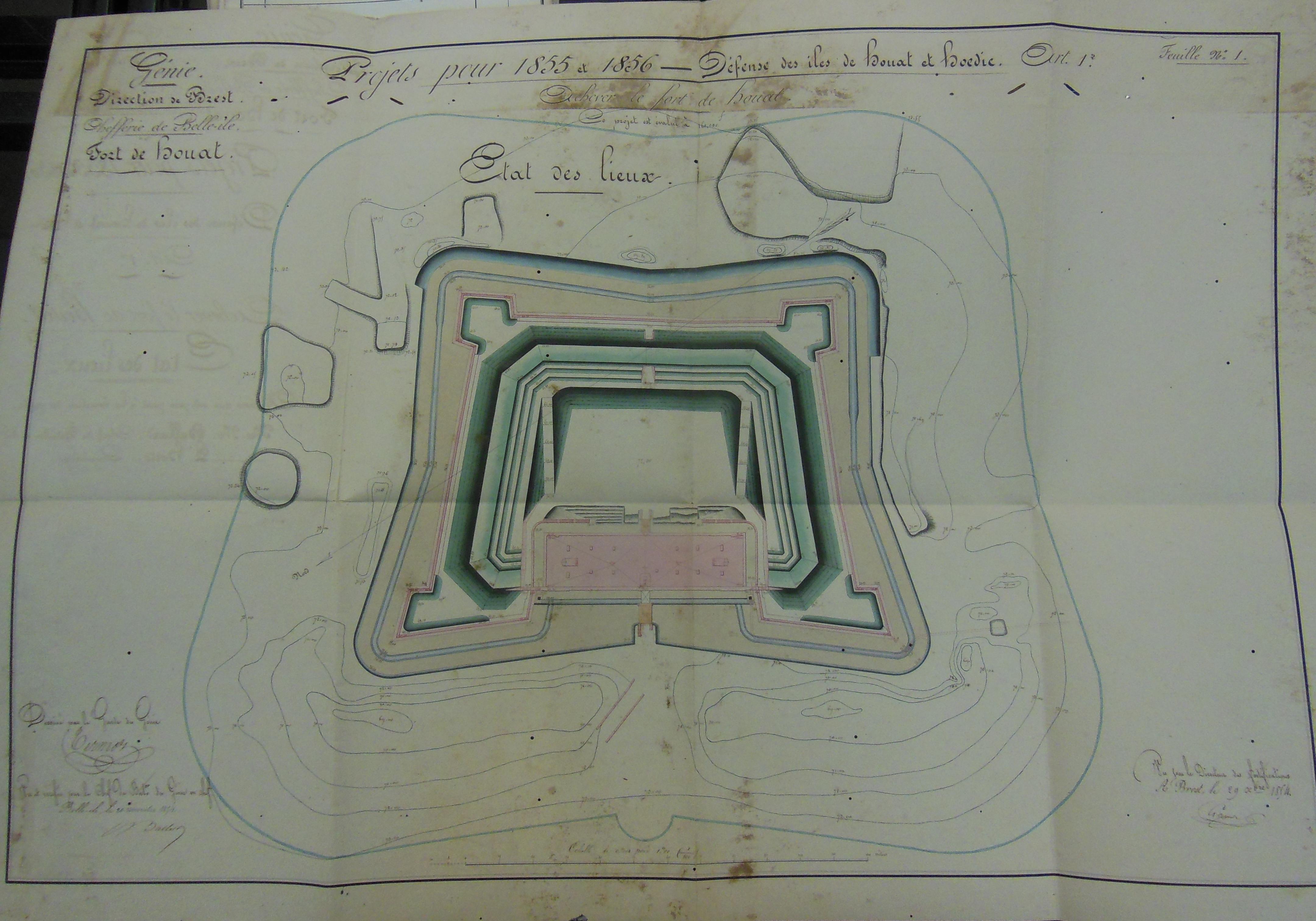 Service historique de la Défense, Département Marine, Lorient. Archives de la Place et du Génie de Belle-Île-en-Mer ; Sous-série 4 S3, archives de la Place de Houat-Hoedic : 4 S3 5, Projets, Houat. Direction du Génie de Brest, Chefferie de Belle-Ile, fort de Houat, feuille n° 1 des projets pour 1855-1856, achever le fort de Houat, état des lieux, 20 novembre 1854.