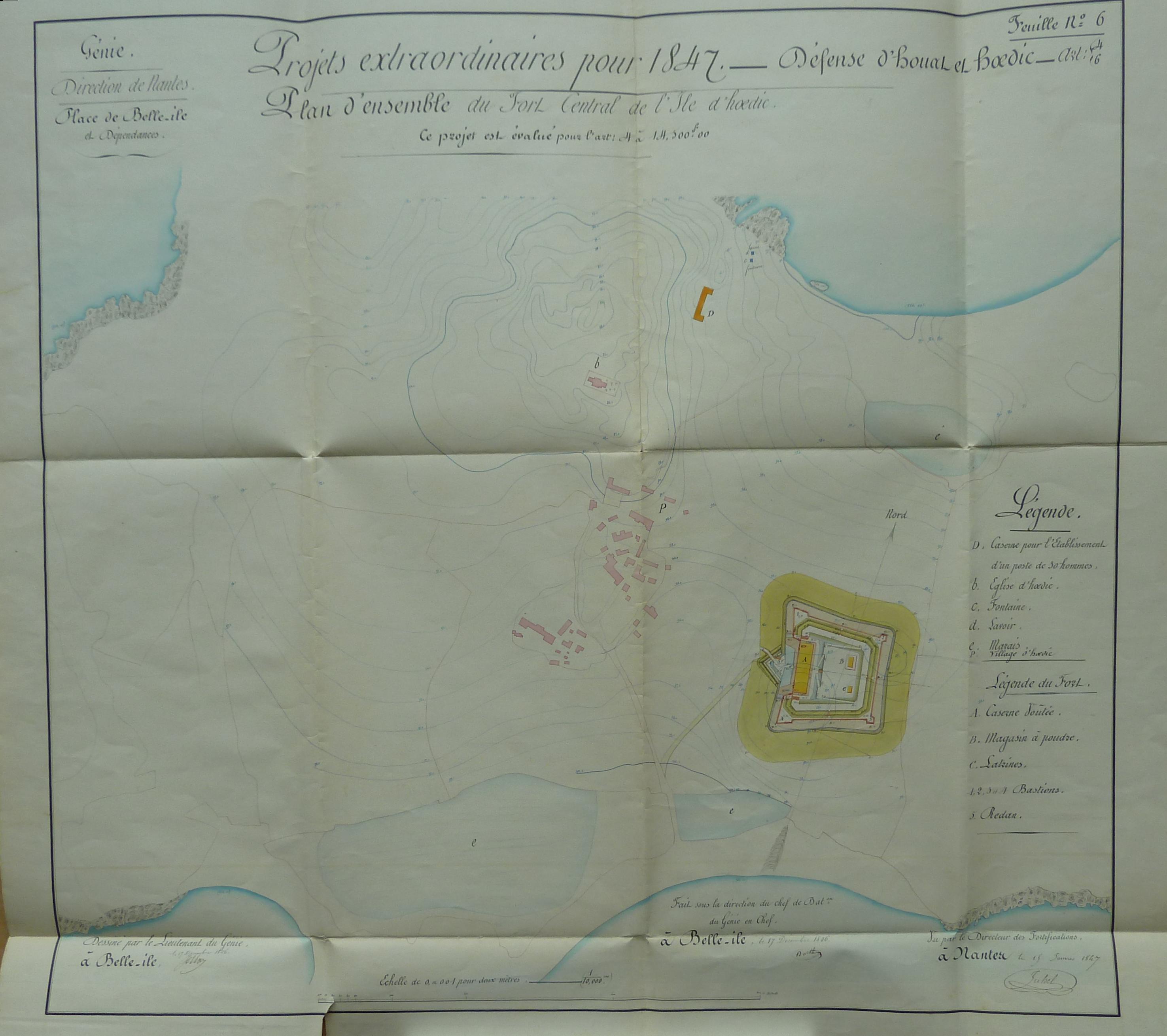 Service historique de la Défense, département Armée de Terre, Vincennes. Archives du Génie ; Article 8, Places françaises et d'Algérie : 1 VH 292, Place de Belle-Île-en-Mer, projets et dépenses annuels, 1847. Direction du Génie de Nantes, Place de Belle-Ile, feuille n° 6 des projets extraordinaires pour 1847, plan d'ensemble du fort central de l'Ile d'Hoedic, 17 décembre 1846.