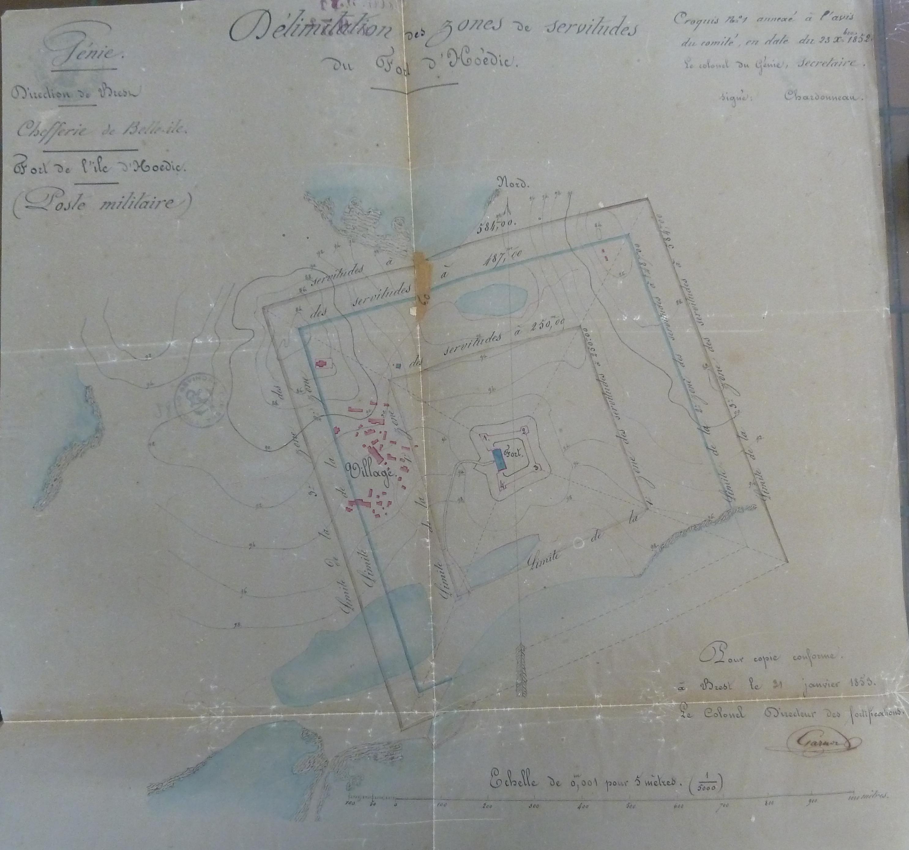 Service historique de la Défense, Département Marine, Lorient. Archives de la Place et du Génie de Belle-Île-en-Mer ; Sous-série 4 S3, archives de la Place de Houat-Hoedic : 4 S3 3, documents en provenance du Comité des fortifications. Croquis n° 1 annexé à l'avis du Comité des fortifications du 23 décembre 1852, délimitation des zones de servitudes du fort d'Hoedic.