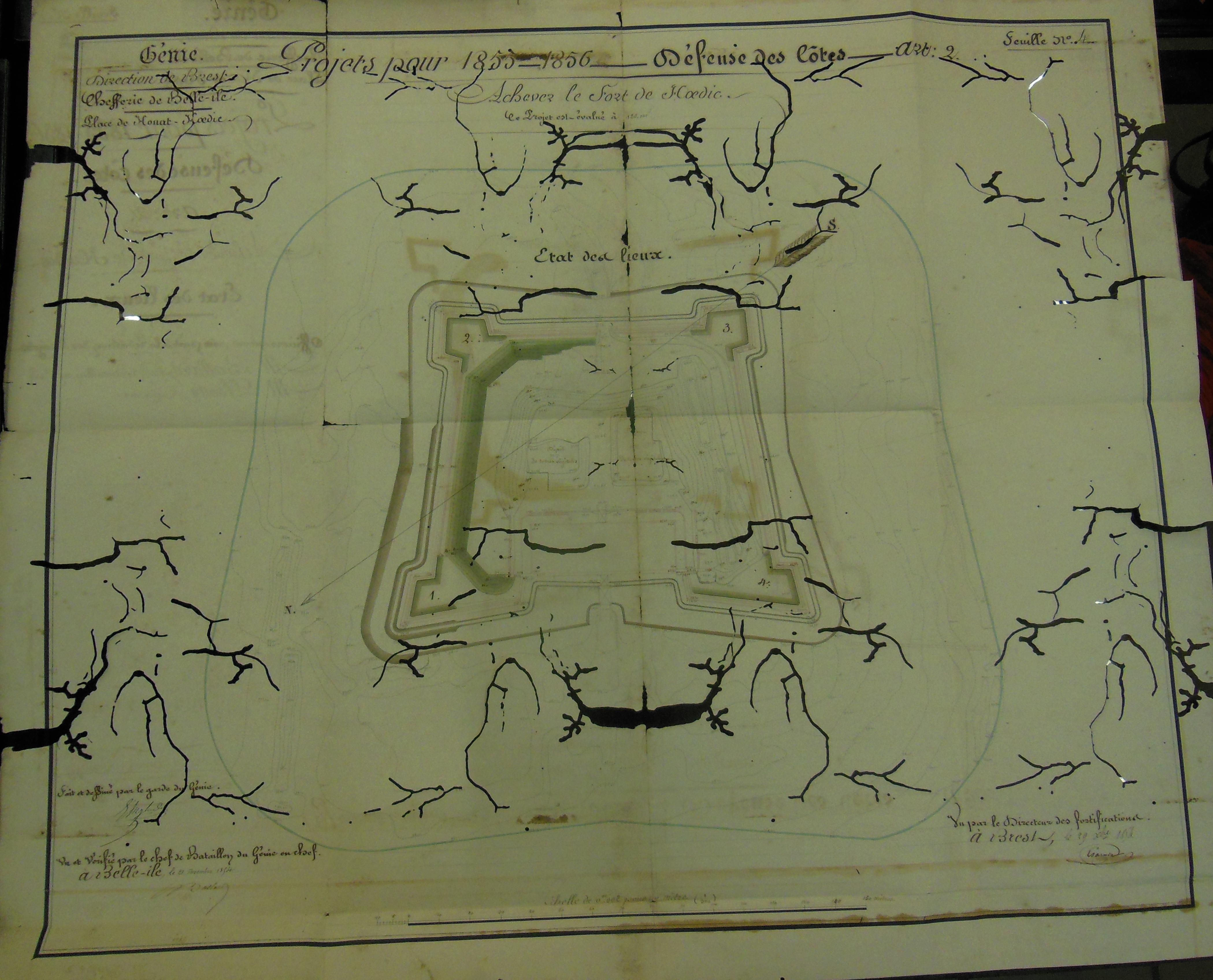 Service historique de la Défense, Département Marine, Lorient. Archives de la Place et du Génie de Belle-Île-en-Mer ; Sous-série 4 S3, archives de la Place de Houat-Hoedic : 4 S3 5, projets, Houat. Direction du Génie de Brest, Place de Houat-Hoedic, feuille n° 4 des projets pour 1855-1856, achever le fort d'Hoedic, état des lieux, 20 novembre 1854.