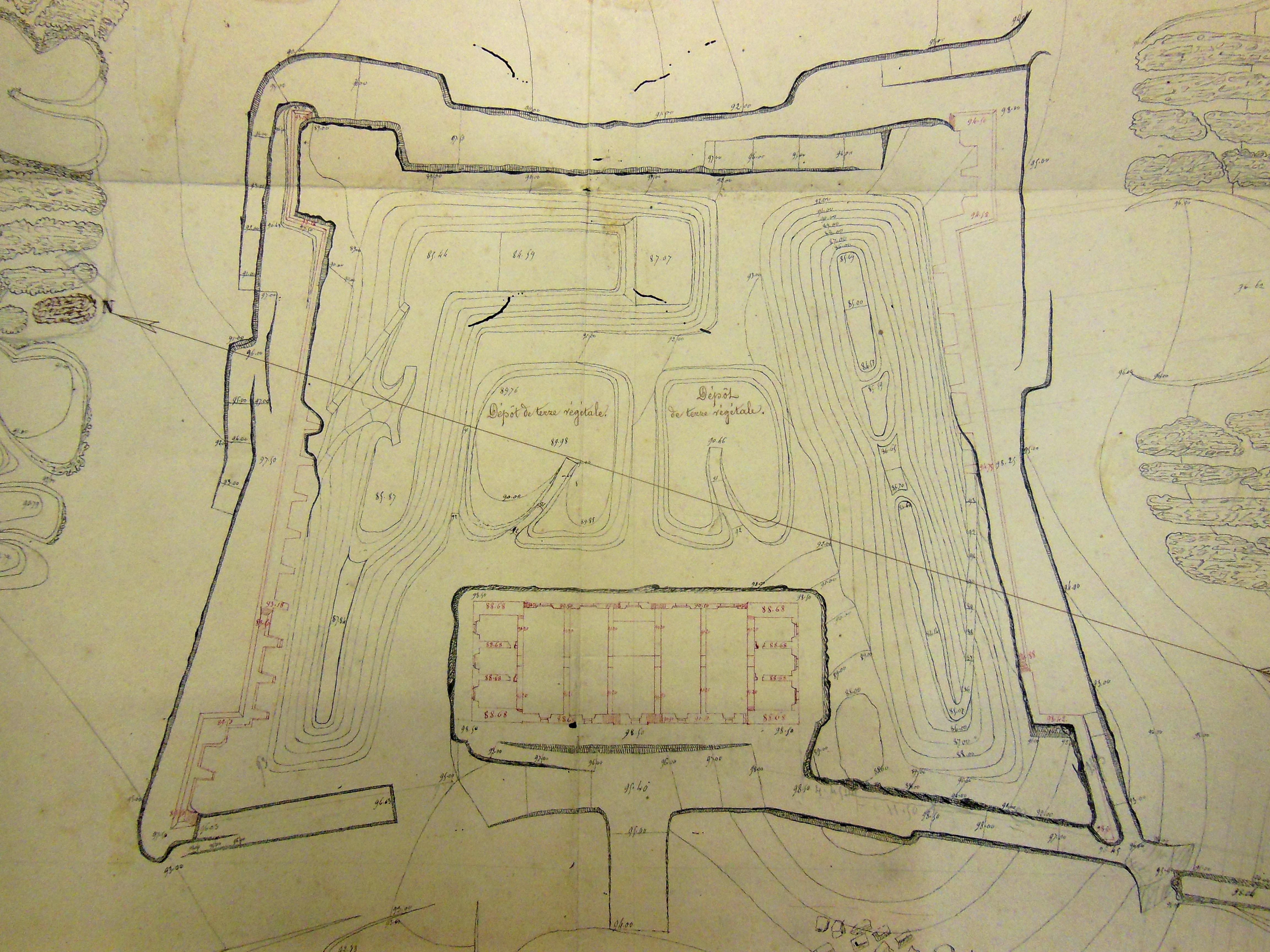 Service historique de la Défense, Département Marine, Lorient. Archives de la Place et du Génie de Belle-Île-en-Mer ; Sous-série 4 S3, archives de la Place de Houat-Hoedic : 4 S3 5, projets, Houat. Direction du Génie de Brest, Place de Houat-Hoedic, feuille n° 7 des projets pour 1851-1852, achever le fort d'Hoedic, état des lieux, 15 décembre 1850.