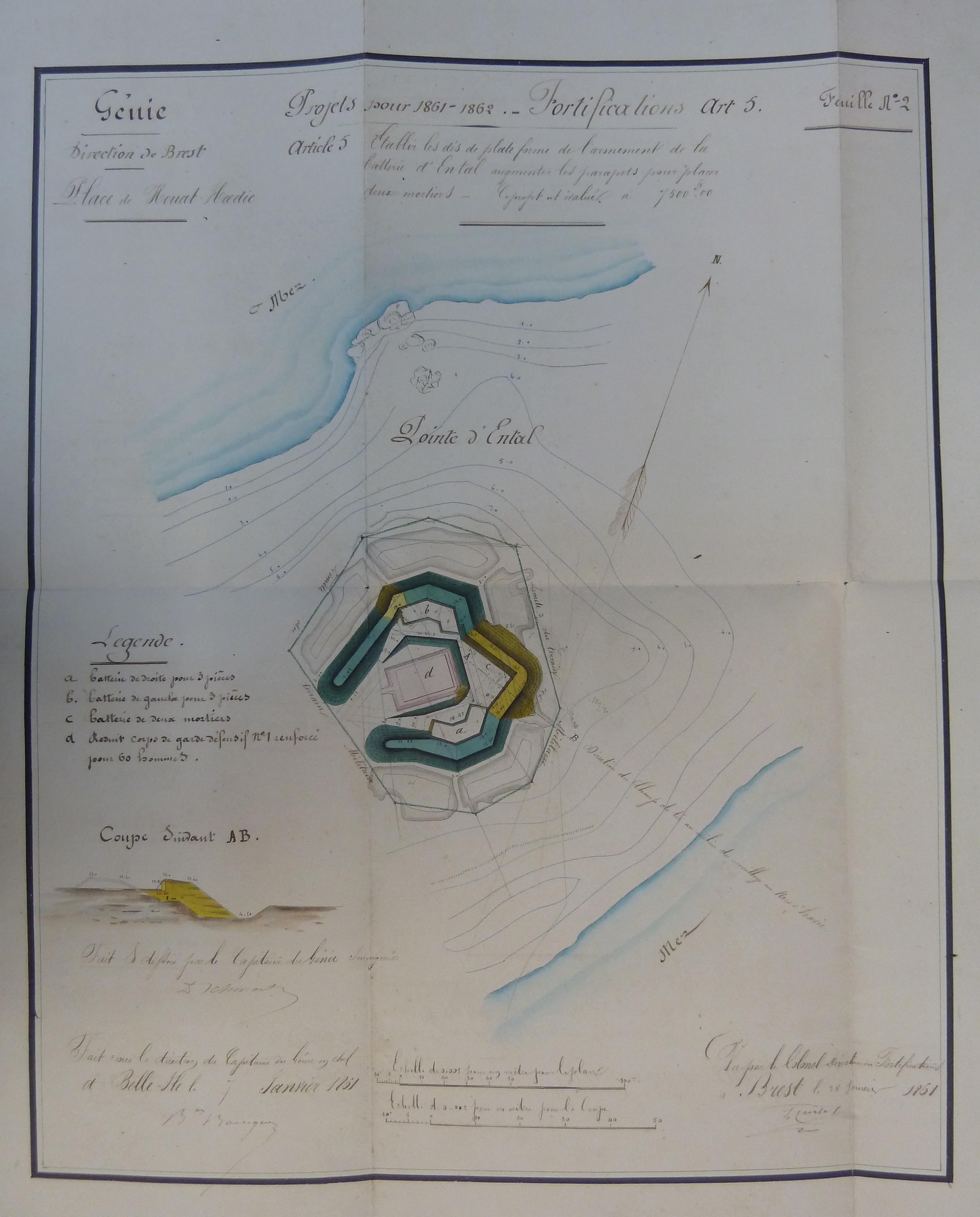 Service historique de la Défense, Département Marine, Lorient. Archives de la Place et du Génie de Belle-Île-en-Mer ; Sous-série 4 S3, archives de la Place de Houat-Hoedic : 4 S3 5, projets, Houat. Direction du génie de Brest, Place de Houat-Hoedic, feuille n° 2 des projets pour 1861-1862, batterie d'En Tal, 7 janvier 1861.