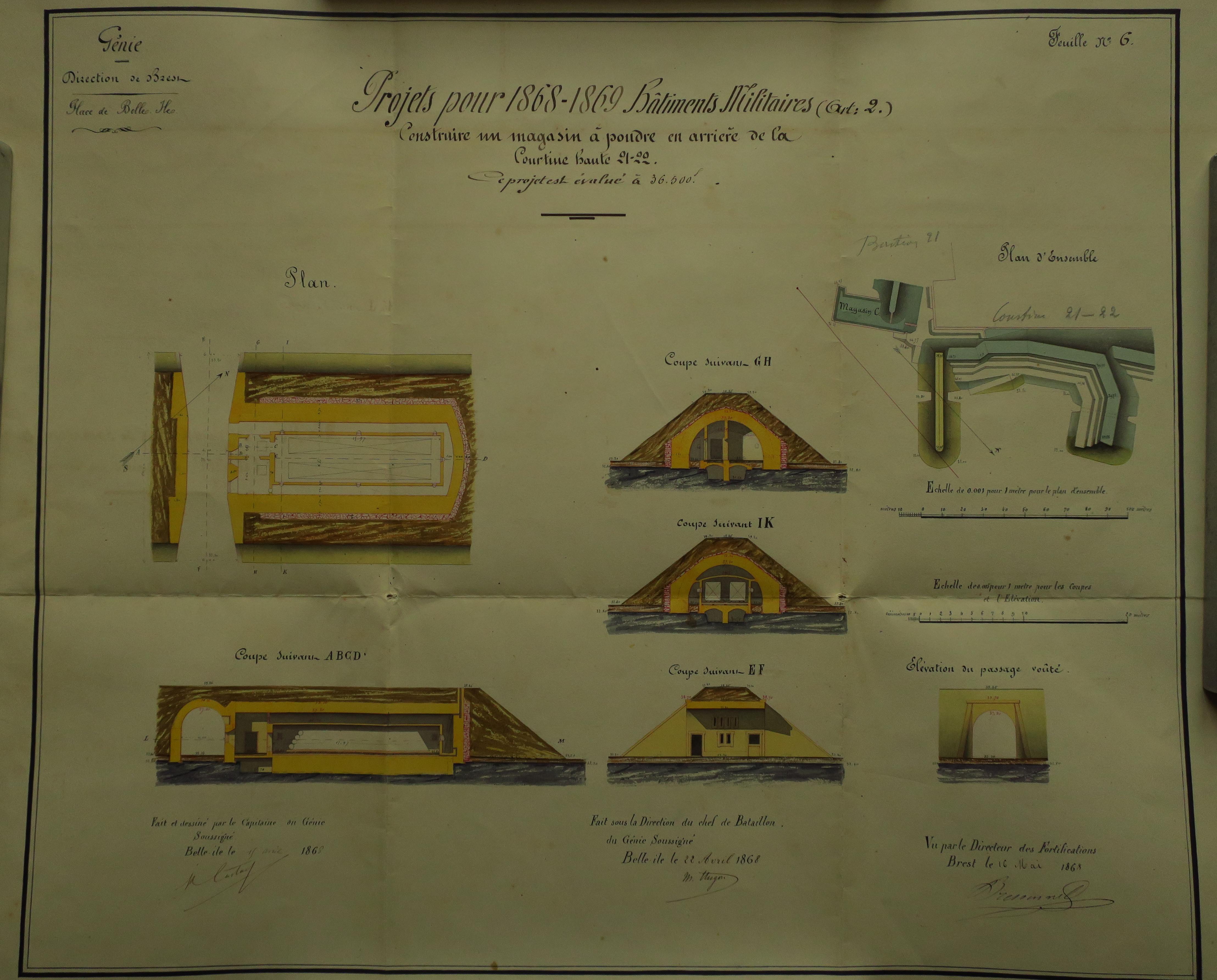 Service historique de la Défense, département Armée de Terre, Vincennes. Archives du Génie ; Article 8, Places françaises et d'Algérie : 1 VH 297, Place de Belle-Île-en-Mer, projets et dépenses annuels, 1862-1875. Direction du Génie de Brest, Place de Belle-Ile, feuille n° 6 des projets supplémentaires pour 1868-1869, construire un magasin à poudre en arrière de la courtine haute 21-22, 22 avril 1868.
