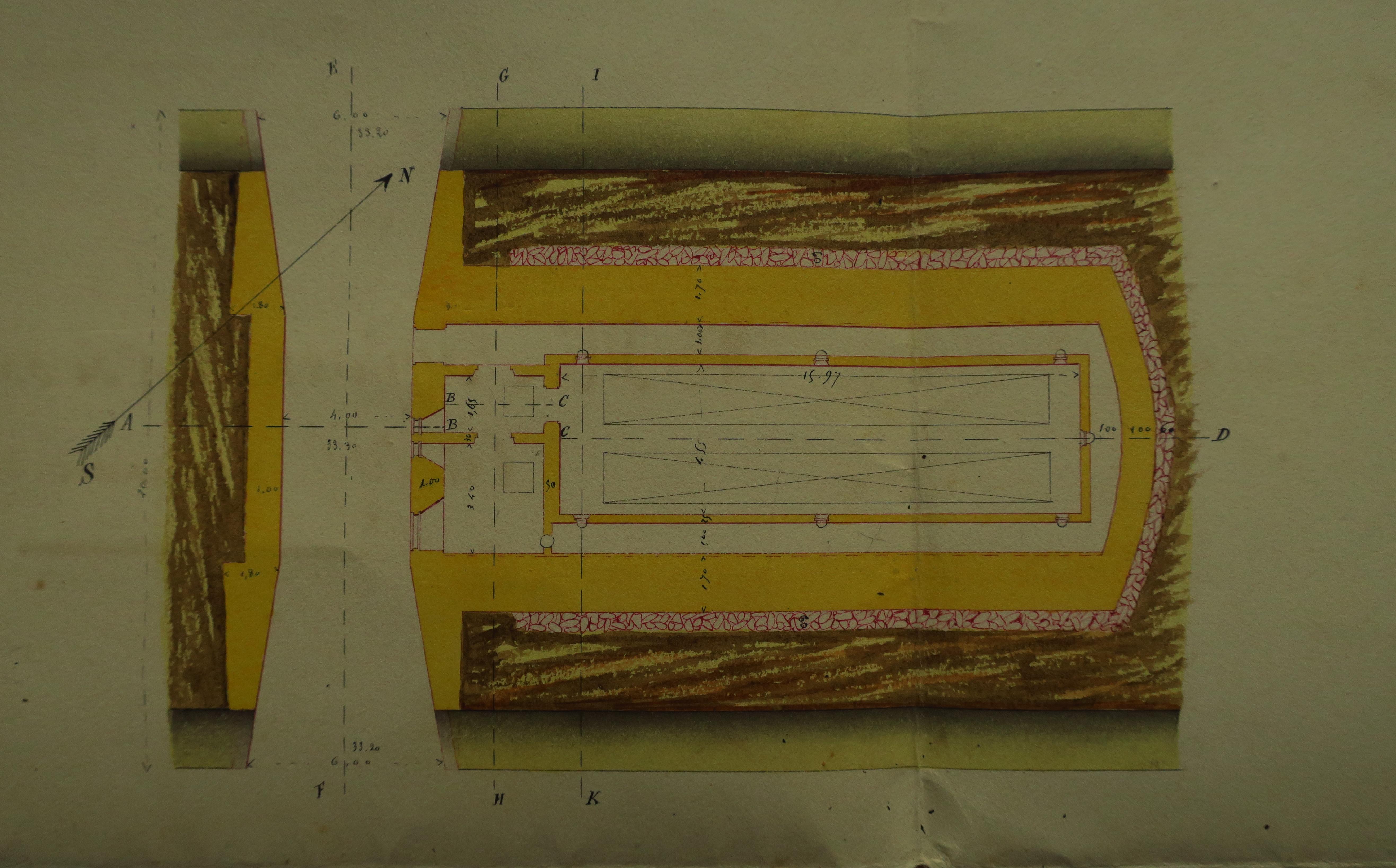 Service historique de la Défense, département Armée de Terre, Vincennes. Archives du Génie ; Article 8, Places françaises et d'Algérie : 1 VH 297, Place de Belle-Île-en-Mer, projets et dépenses annuels, 1862-1875. Direction du Génie de Brest, Place de Belle-Ile, feuille n° 6 des projets supplémentaires pour 1868-1869, construire un magasin à poudre en arrière de la courtine haute 21-22, 22 avril 1868.