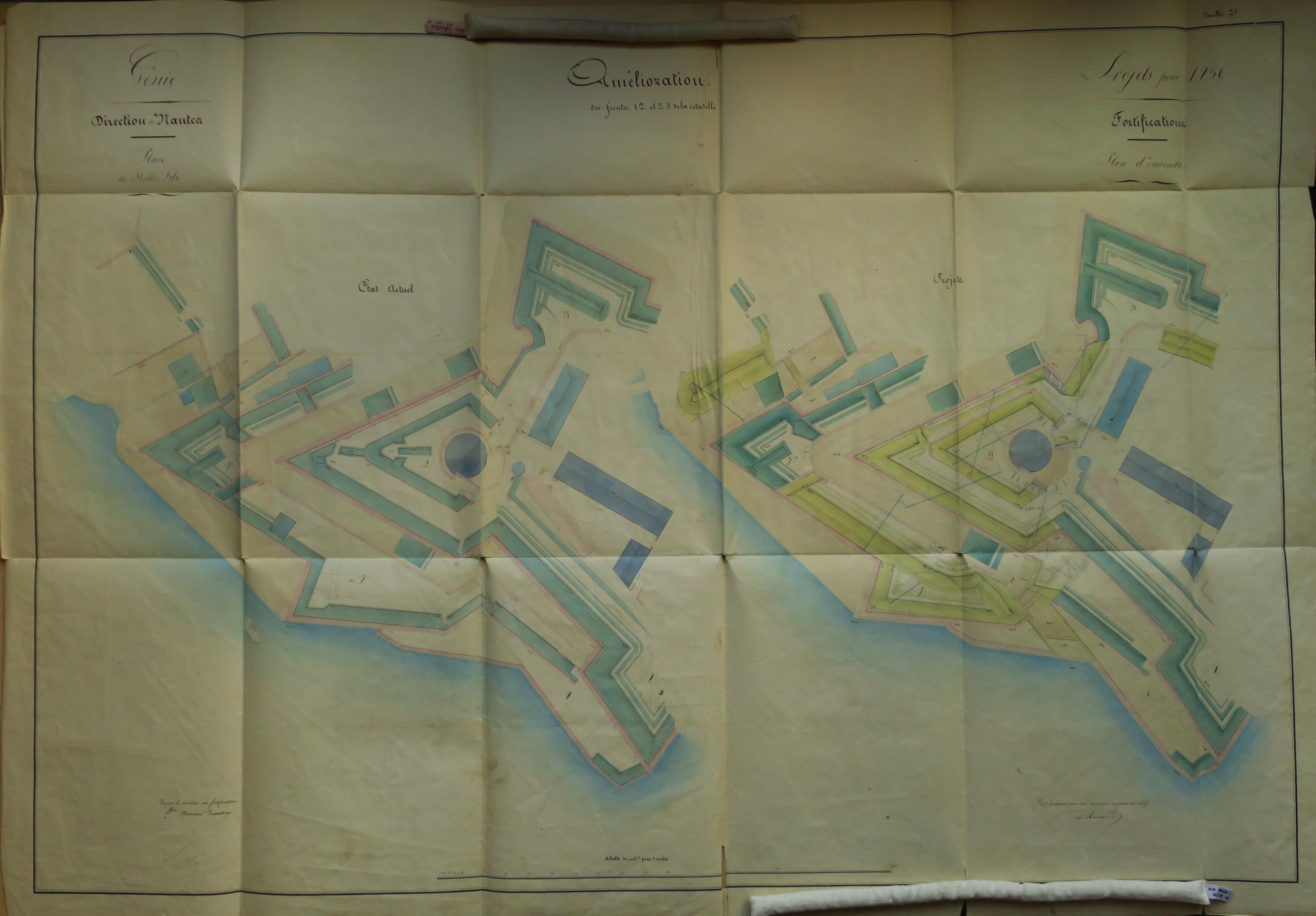 Service historique de la Défense, département Armée de Terre, Vincennes. Archives du Génie ; Article 8, Places françaises et d'Algérie : 1 VH 289, Place de Belle-Île-en-Mer, projets et dépenses annuels, 1831-1836. Direction du Génie de Nantes, Place de Belle-Ile, feuille n°2 des projets pour 1836, amélioration des fronts 1-2 et 2-3 de la citadelle, s.d.