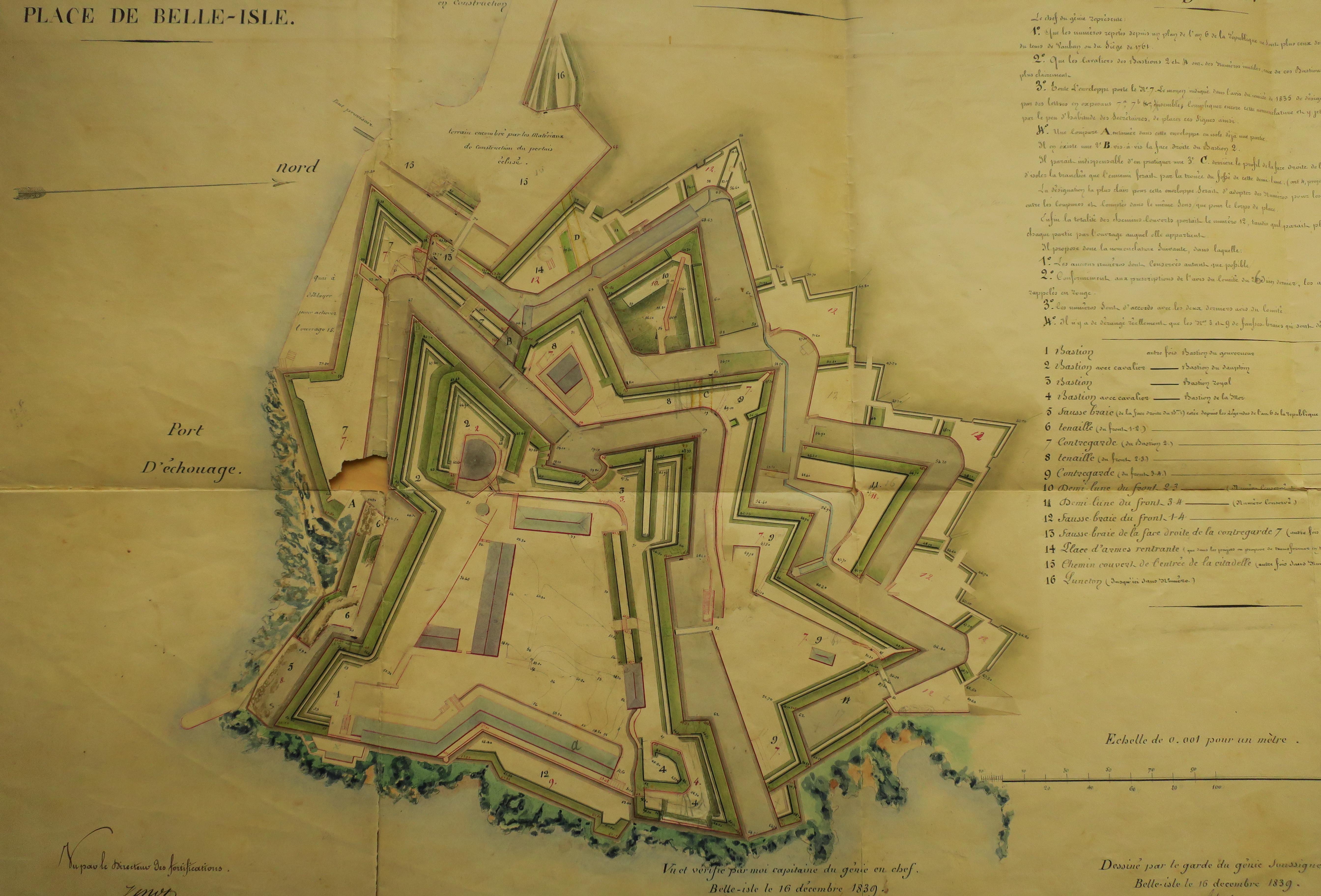Service historique de la Défense, département Armée de Terre, Vincennes. Archives du Génie ; Article 8, Places françaises et d'Algérie : 1 VH 290, Place de Belle-Île-en-Mer, projets et dépenses annuels, 1837-1842. Direction du Génie de Nantes, Place de Belle-Isle, feuille n° 3 des projets pour 1840, citadelle, état des lieux, 16 décembre 1839.