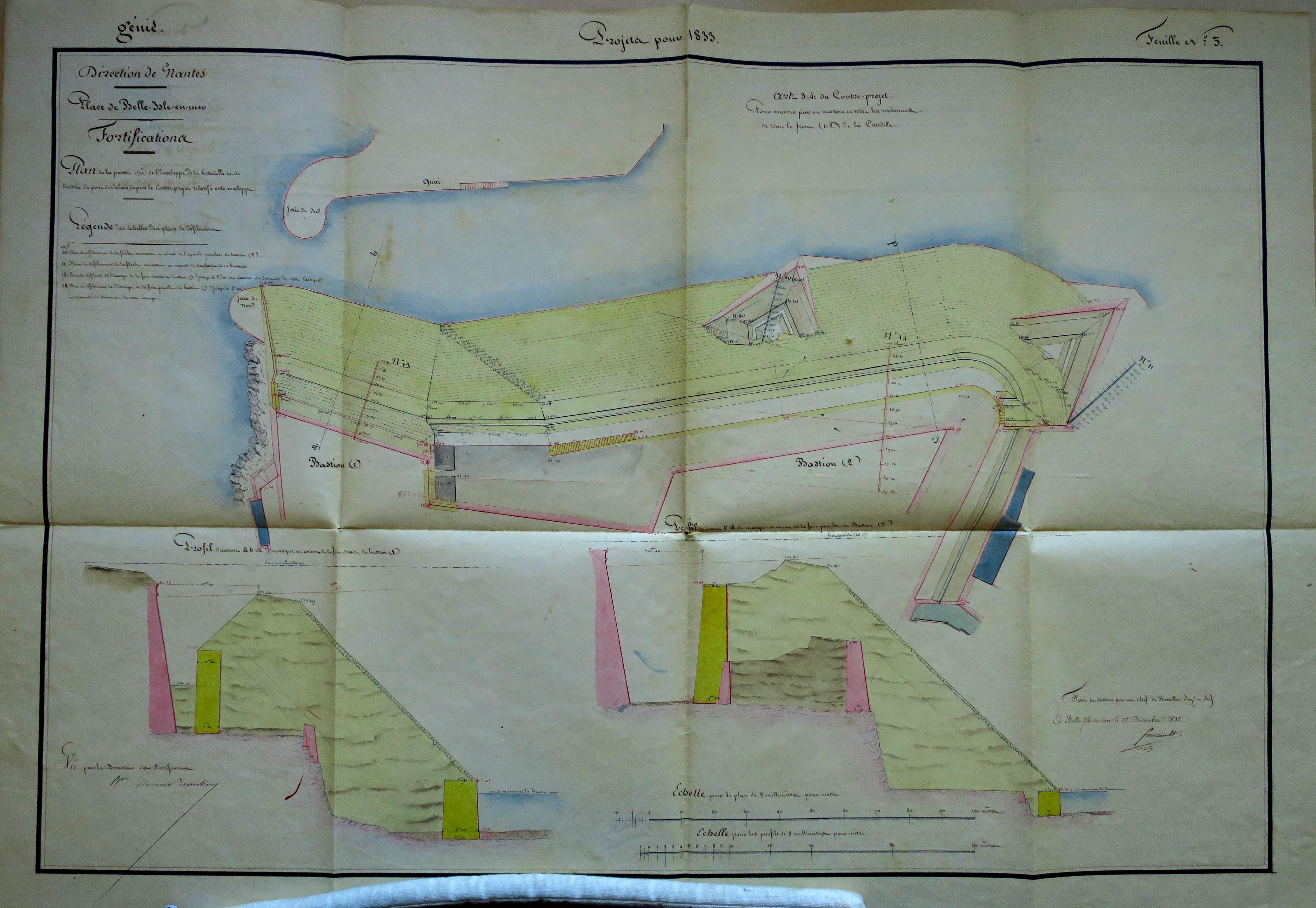 Service historique de la Défense, département Armée de Terre, Vincennes. Archives du Génie ; Article 8, Places françaises et d'Algérie : 1 VH 289, Place de Belle-Île-en-Mer, projets et dépenses annuels, 1831-1836. Direction du Génie de Nantes, Place de Belle-Isle-en-Mer, feuille n° 3 des projets pour 1833, pour couvrir par un masque en terre les revêtements de tout le front (1-2) de la citadelle, 17 décembre 1832.