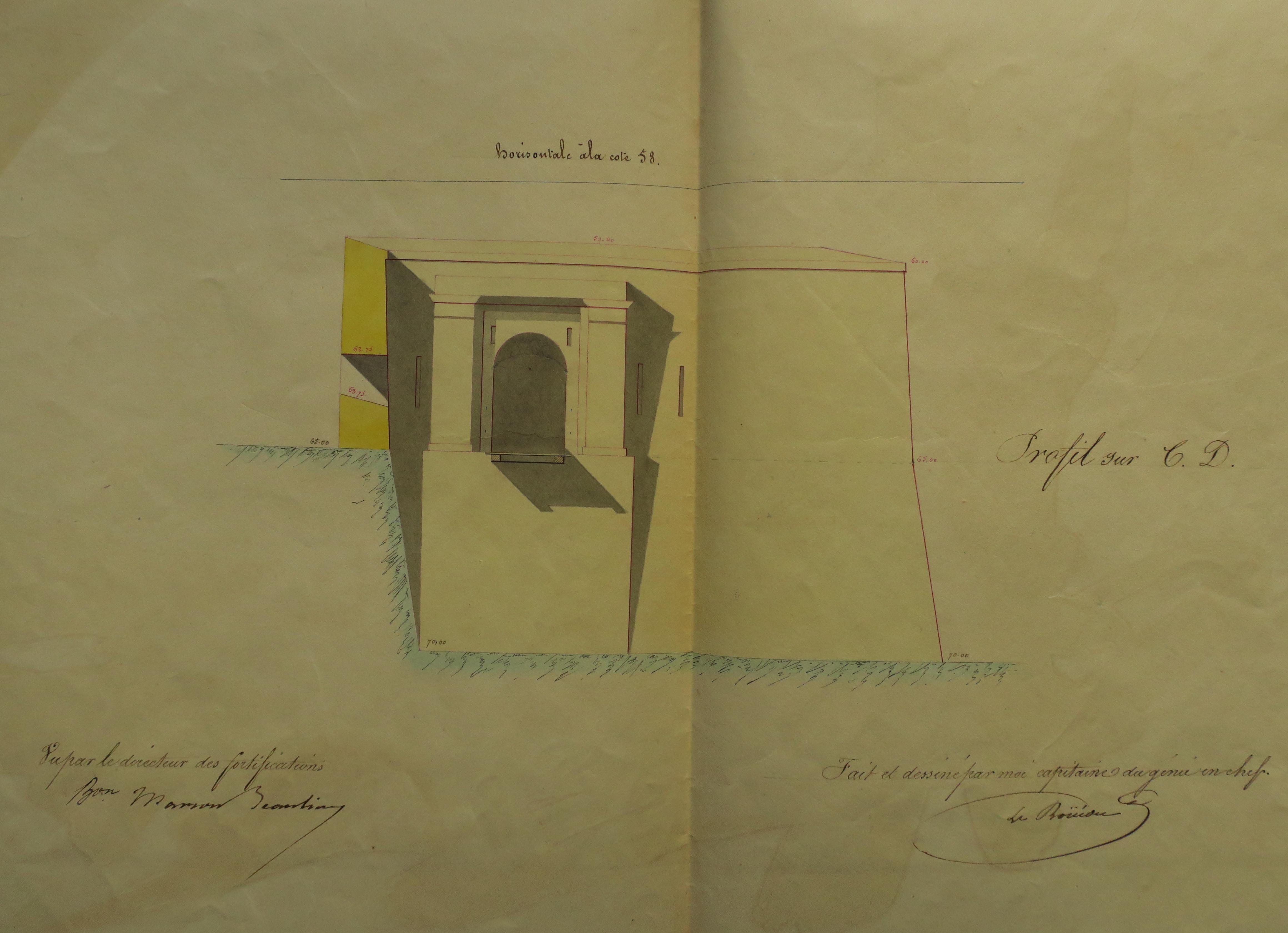 Service historique de la Défense, département Armée de Terre, Vincennes. Archives du Génie ; Article 8, Places françaises et d'Algérie : 1 VH 289, Place de Belle-Île-en-Mer, projets et dépenses annuels, 1831-1836. Direction du Génie de Nantes, Place de Belle-Ile, feuille n° 4 des projets pour 1836, coupure à l'angle depuis la gauche du bastion 2, s.d.