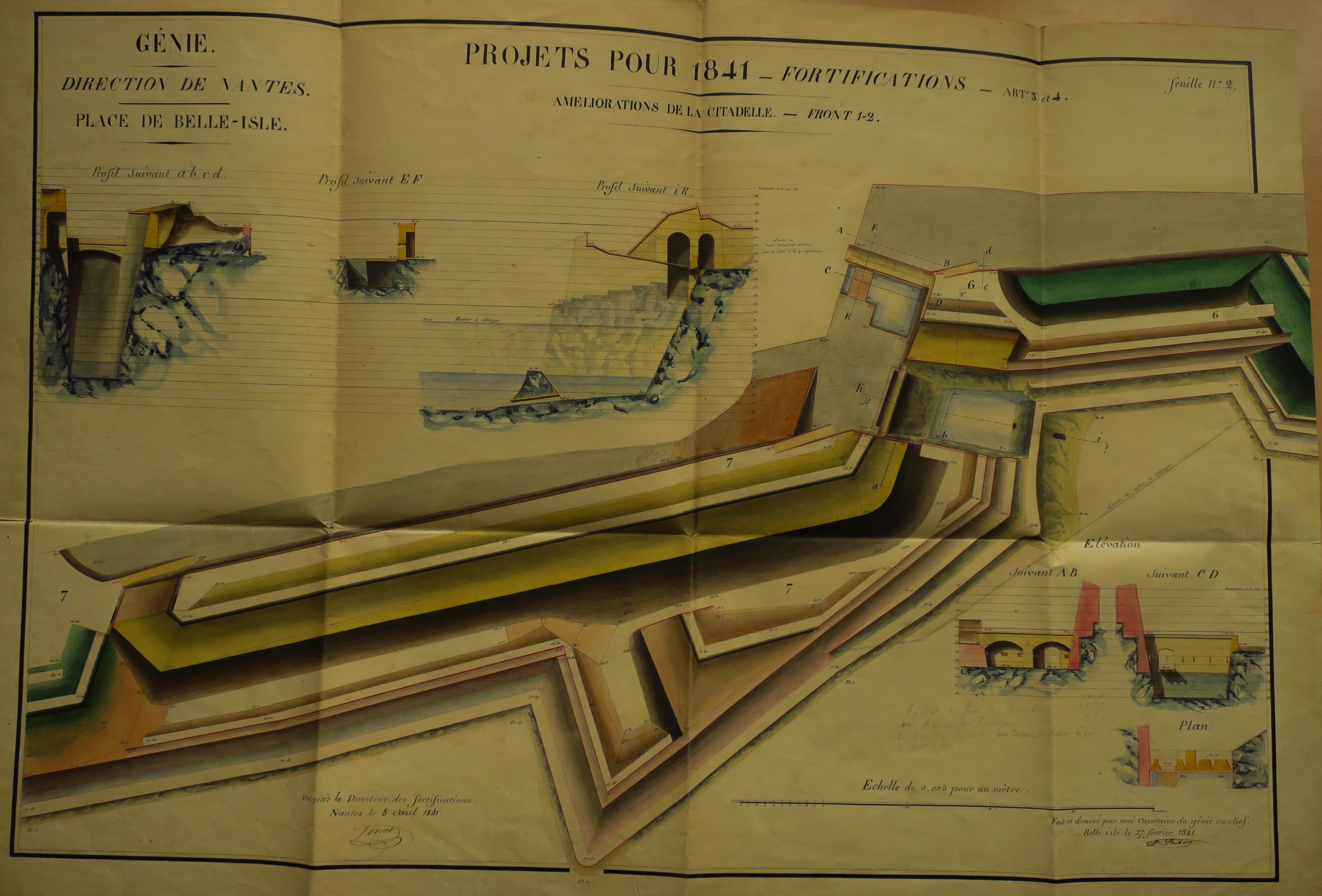 Service historique de la Défense, département Armée de Terre, Vincennes. Archives du Génie ; Article 8, Places françaises et d'Algérie : 1 VH 290, Place de Belle-Île-en-Mer, projets et dépenses annuels, 1837-1842. Direction du Génie de Nantes, Place de Belle-Ile, feuille n° 2 des projets pour 1841, améliorations de la citadelle, front 1-2, 27 février 1841.