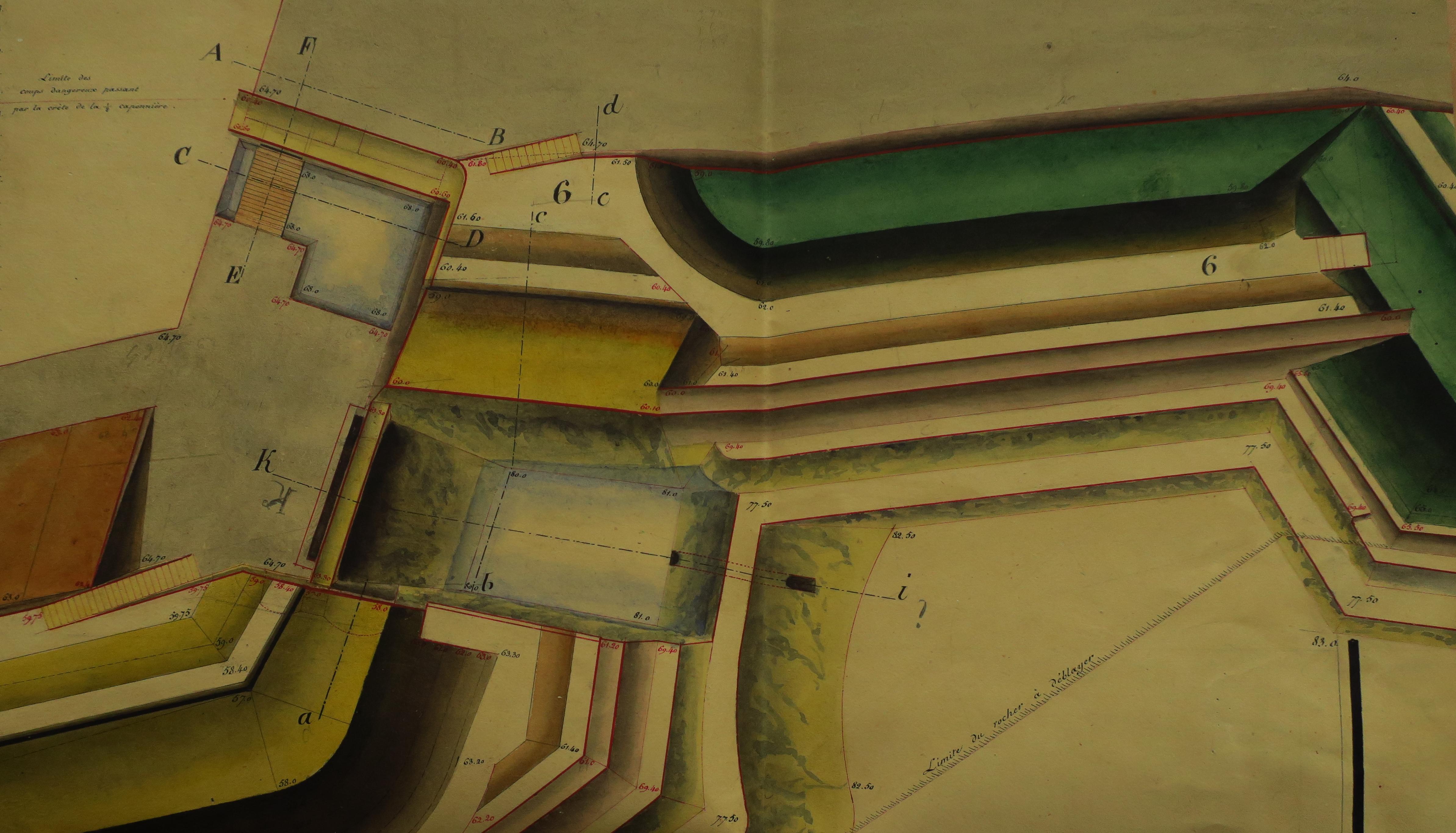 Service historique de la Défense, département Armée de Terre, Vincennes. Archives du Génie ; Article 8, Places françaises et d'Algérie : 1 VH 290, Place de Belle-Île-en-Mer, projets et dépenses annuels, 1837-1842. Direction du Génie de Nantes, Place de Belle-Ile, feuille n° 2 des projets pour 1841, améliorations de la citadelle, front 1-2, 27 février 1841.