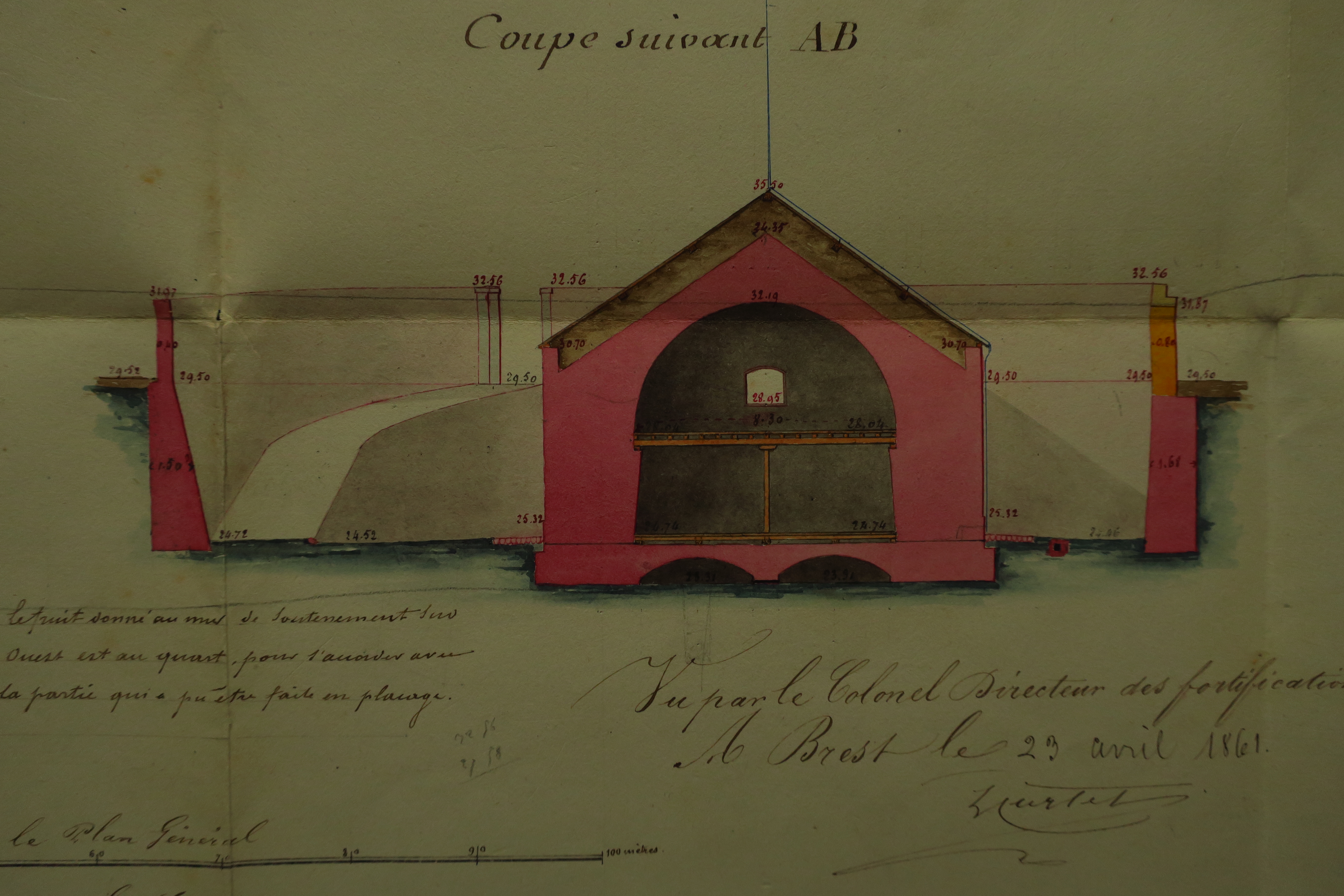 Service historique de la Défense, département Armée de Terre, Vincennes. Archives du Génie ; Article 8, Places françaises et d'Algérie : 1 VH 296, Place de Belle-Île-en-Mer, projets et dépenses annuels, 1860-1861. Direction du Génie de Brest, Place de Belle-Ile, feuille n° 16 des projets pour 1860-1861, construire un magasin à poudre dans l'intérieur du redan 9ter, 11 avril 1861.