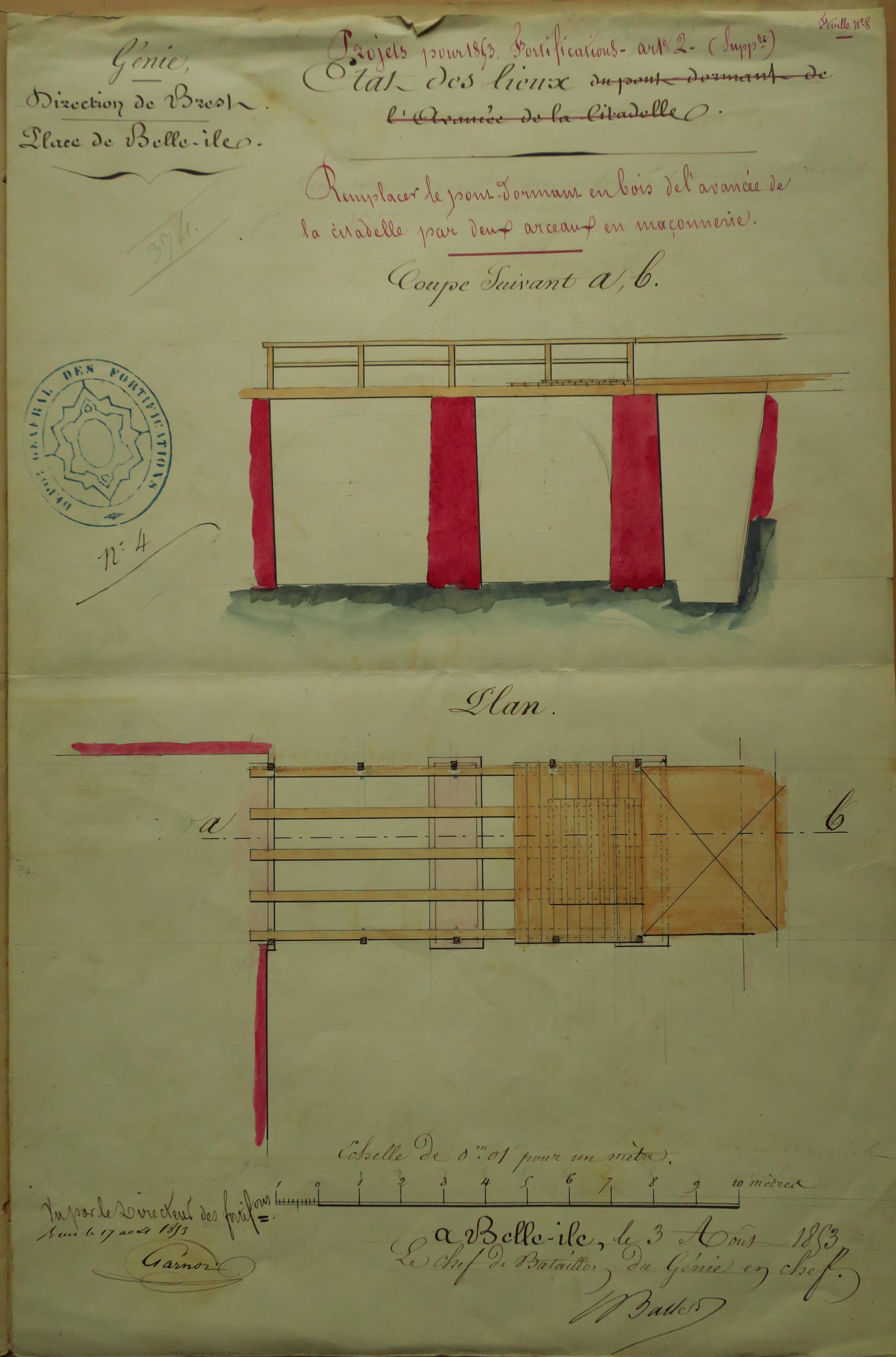 Service historique de la Défense, département Armée de Terre, Vincennes. Archives du Génie ; Article 8, Places françaises et d'Algérie : 1 VH 293, Place de Belle-Île-en-Mer, projets et dépenses annuels, 1848-1853. Direction du Génie de Brest, Place de Belle-Ile, feuille n° 8 des projets pour 1853, remplacer le pont-dormant en bois de l'avancée de la citadelle par deux arceaux en maçonnerie, état des lieux, 3 août 1853.