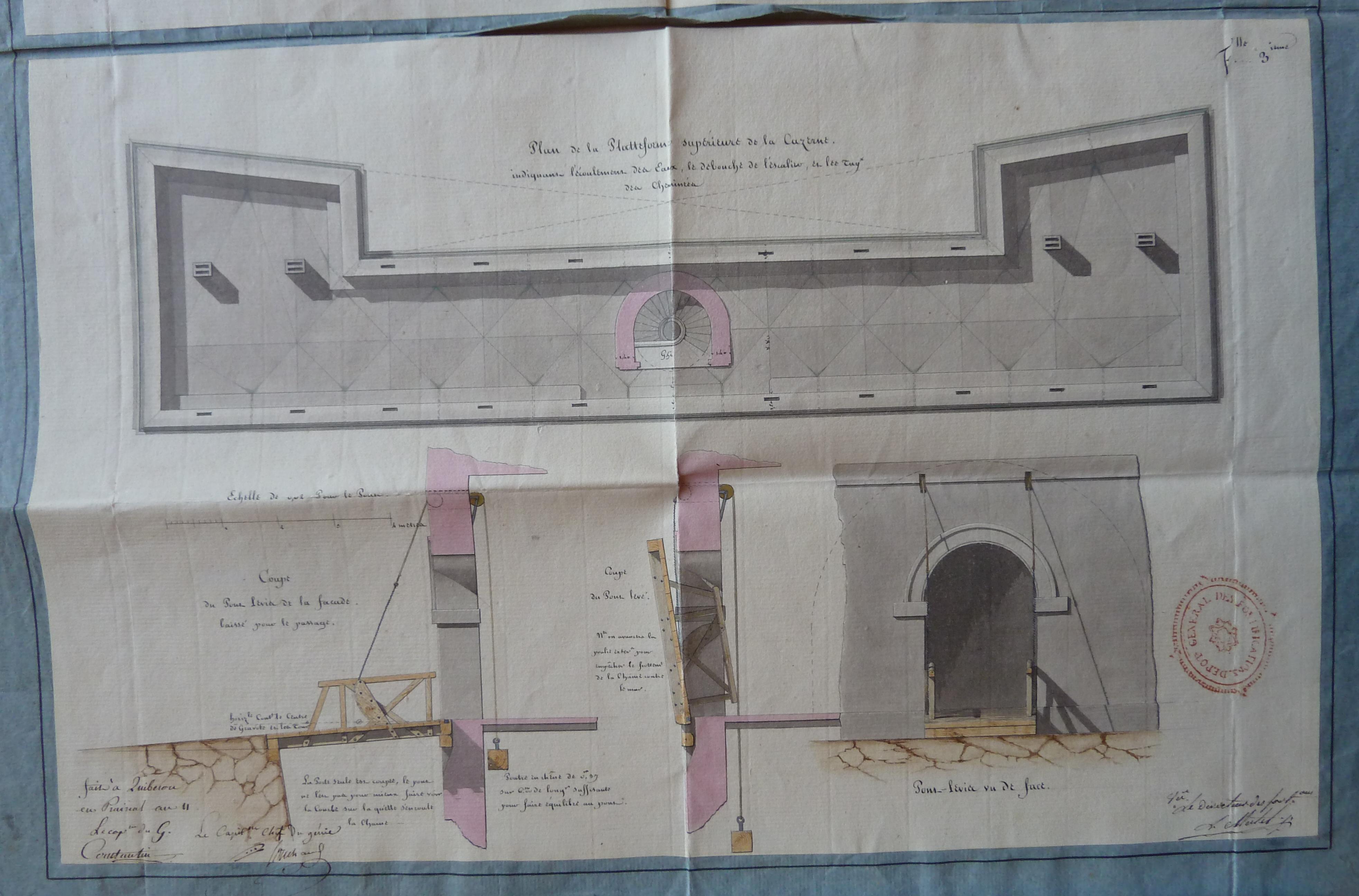 Service historique de la Défense, département Armée de Terre, Vincennes. Archives du Génie ; Article 8, Places françaises et d'Algérie : 1 VH 1515, Place de Quiberon, projets et dépenses annuels, 1747-1822. Direction du Génie de Port-Liberté, Poste de Quiberon, an 11 [1802-1803], plans de la caserne défensive projettée à la gorge du fort Penthièvre, prairial an 11 [mai-juin 1803].