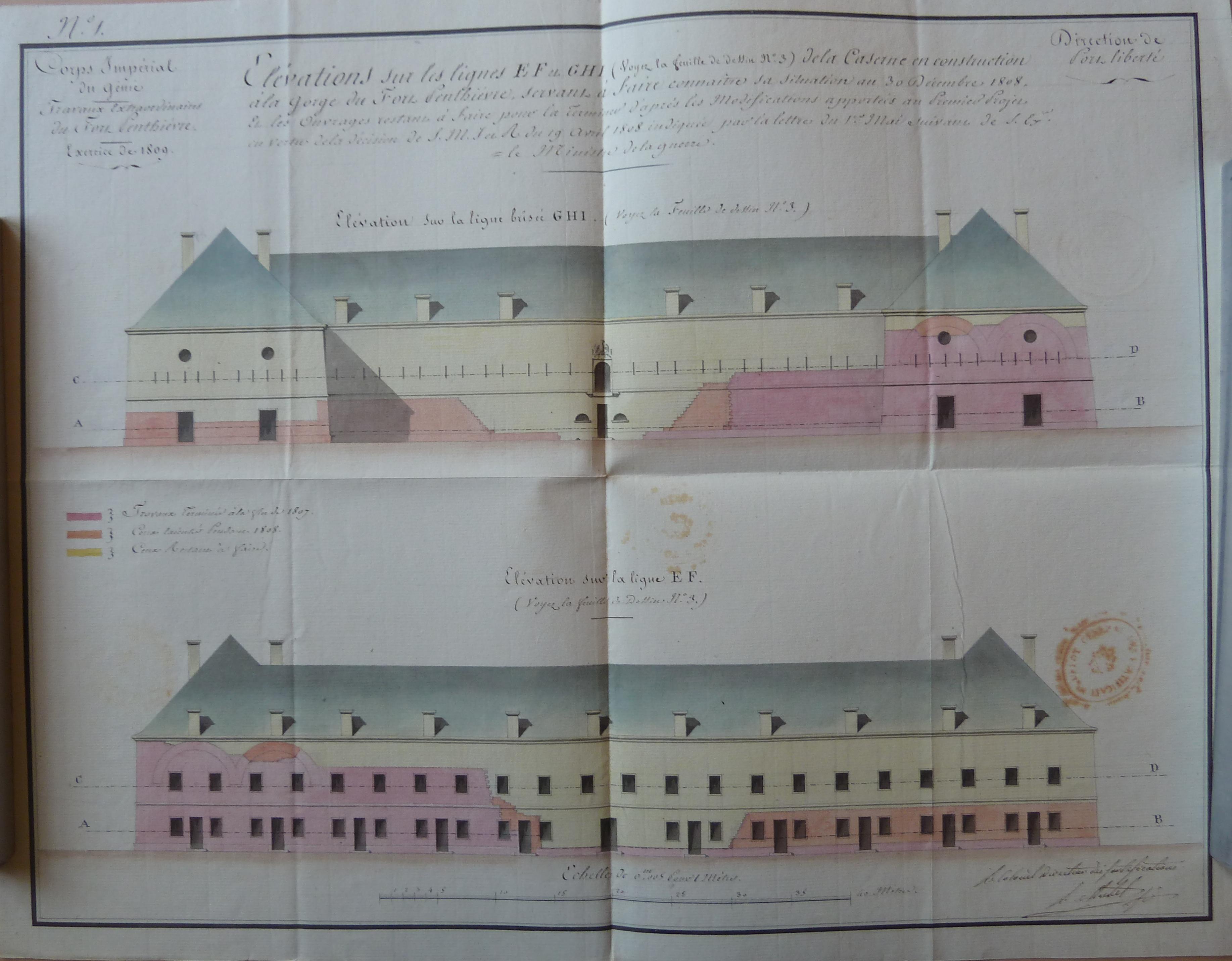1 VH 1515. Direction du Génie de Port-Liberté, Travaux extraordinaires du fort Penthièvre, élévations de la caserne en construction à la gorge du fort Penthièvre, servant à faire connaître sa situation au 30 décembre 1808.Immatriculation