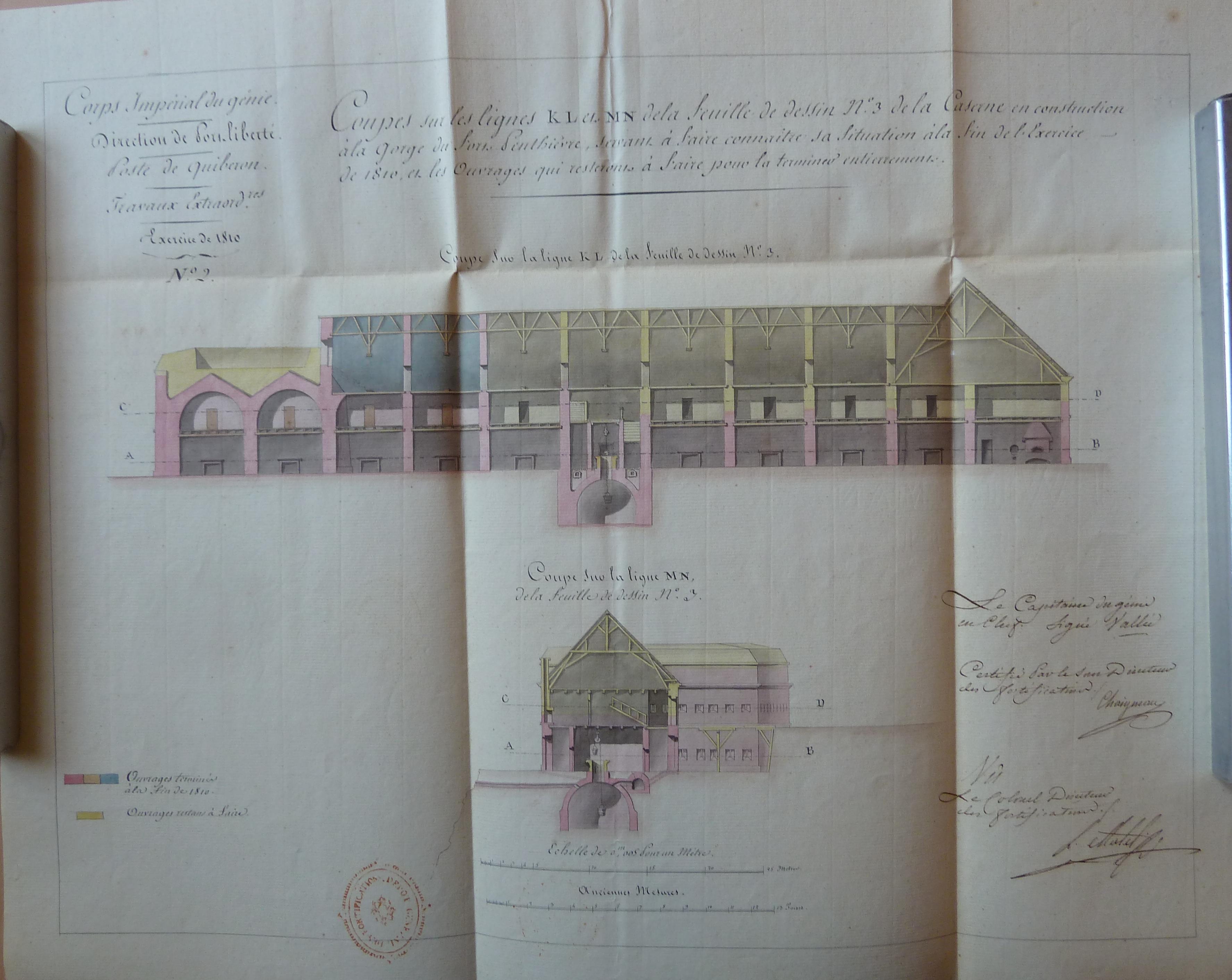 Service historique de la Défense, département Armée de Terre, Vincennes. Archives du Génie ; Article 8, Places françaises et d'Algérie : 1 VH 1515, Place de Quiberon, projets et dépenses annuels, 1747-1822. Direction du Génie de Port-Liberté, Poste de Quiberon, coupes de la caserne en construction à la gorge du fort Penthièvre, servant à faire connaître sa situation à la fin de l'année de 1810.