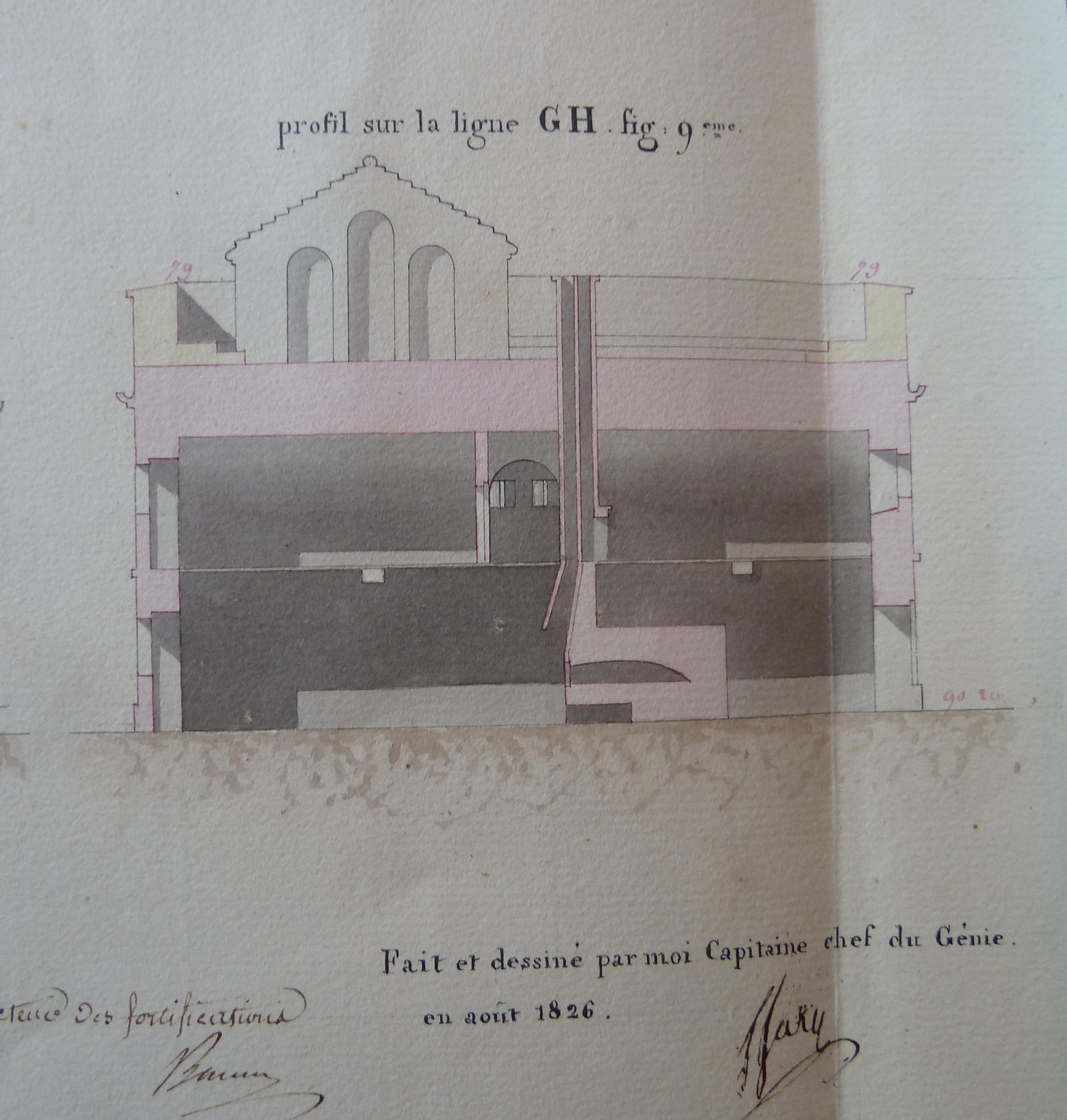 Service historique de la Défense, département Armée de Terre, Vincennes. Archives du Génie ; Article 8, Places françaises et d'Algérie : 1 VH 1516, Place de Quiberon, projets et dépenses annuels, 1823-1837. Direction du Génie de Port-Louis, Poste de Quiberon, feuille n° 2 des projets pour 1827, profils de la caserne défensive du fort Penthièvre, août 1826.