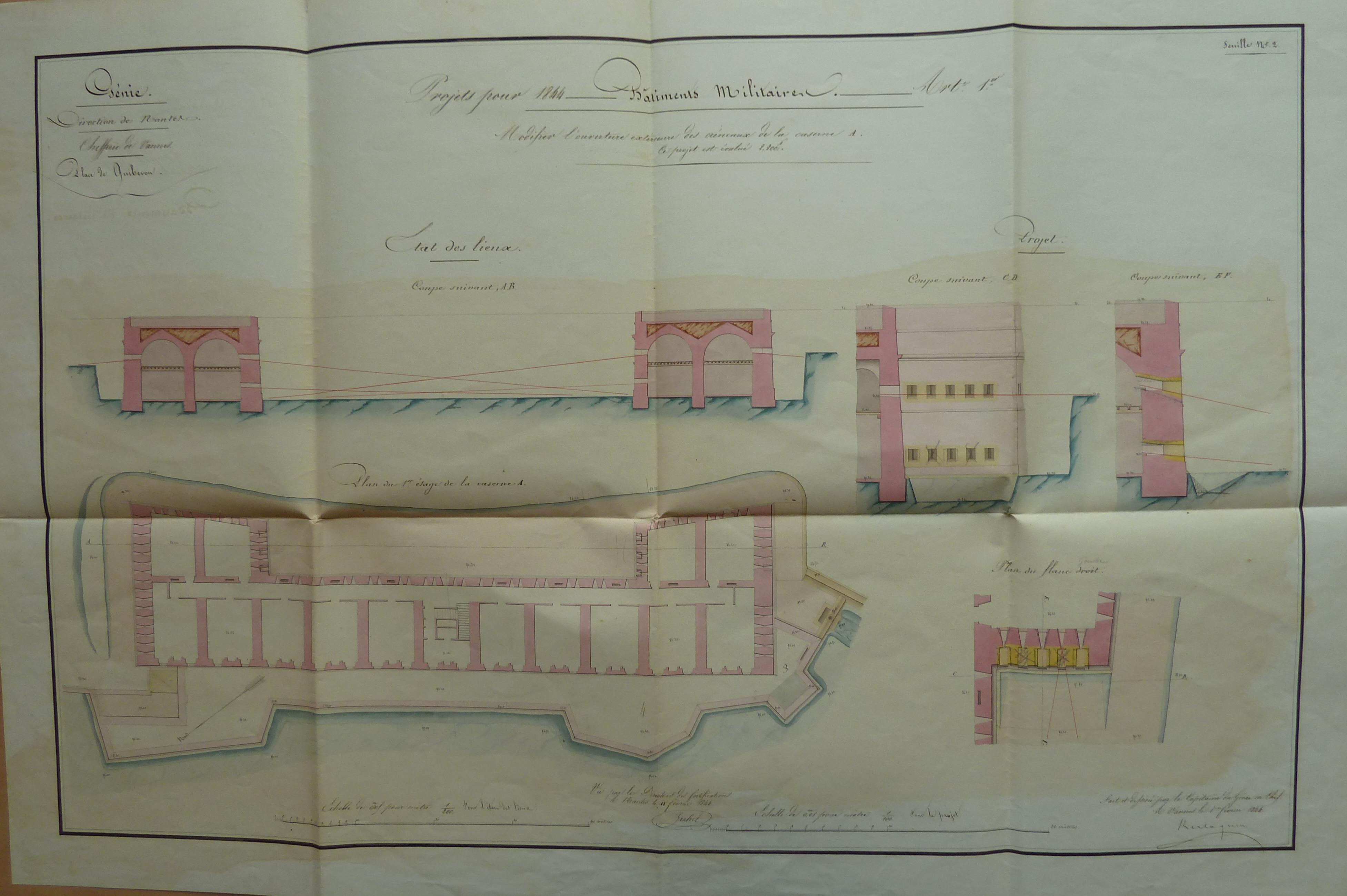 Service historique de la Défense, département Armée de Terre, Vincennes. Archives du Génie ; Article 8, Places françaises et d'Algérie : 1 VH 1517, Place de Quiberon, projets et dépenses annuels, 1838-1846. Direction du Génie de Nantes, Place de Quiberon, feuille n° 2 des projets pour 1844, modifier l'ouverture extérieure des créneaux de la caserne A, 1er février 1844.