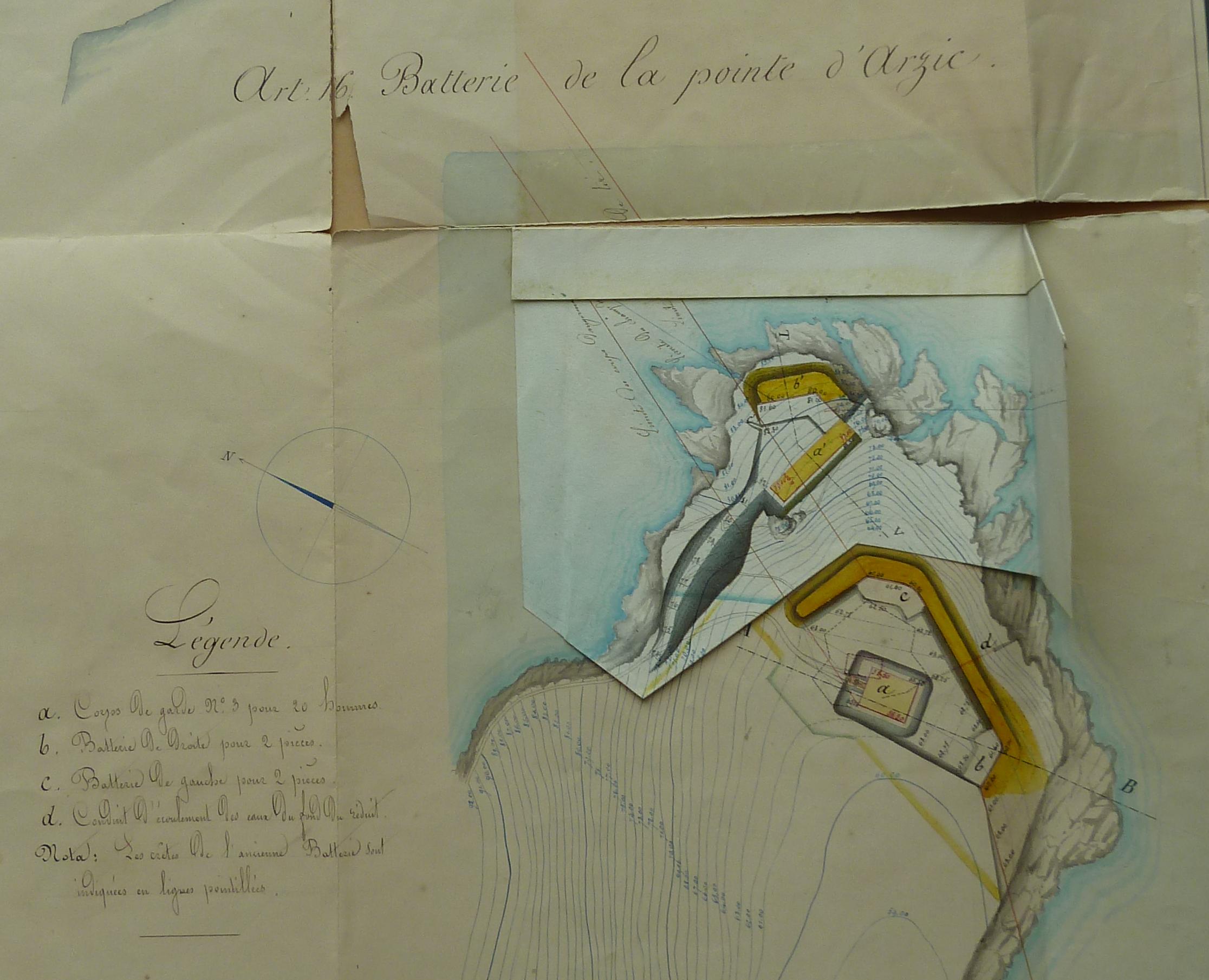Service historique de la Défense, département Armée de Terre, Vincennes. Archives du Génie ; Article 8, Places françaises et d'Algérie : 1 VH 294, Place de Belle-Île-en-Mer, projets et dépenses annuels, 1854-1857. Direction du Génie de Brest, Place de Belle-Ile, feuille n° 10 des projets extraordinaires pour 1857-1858, batteries d'Arzic, postes garde-côtes de Port Maria et Port Andro, 19 février 1857 [papillote de correction du 18 mars 1857].