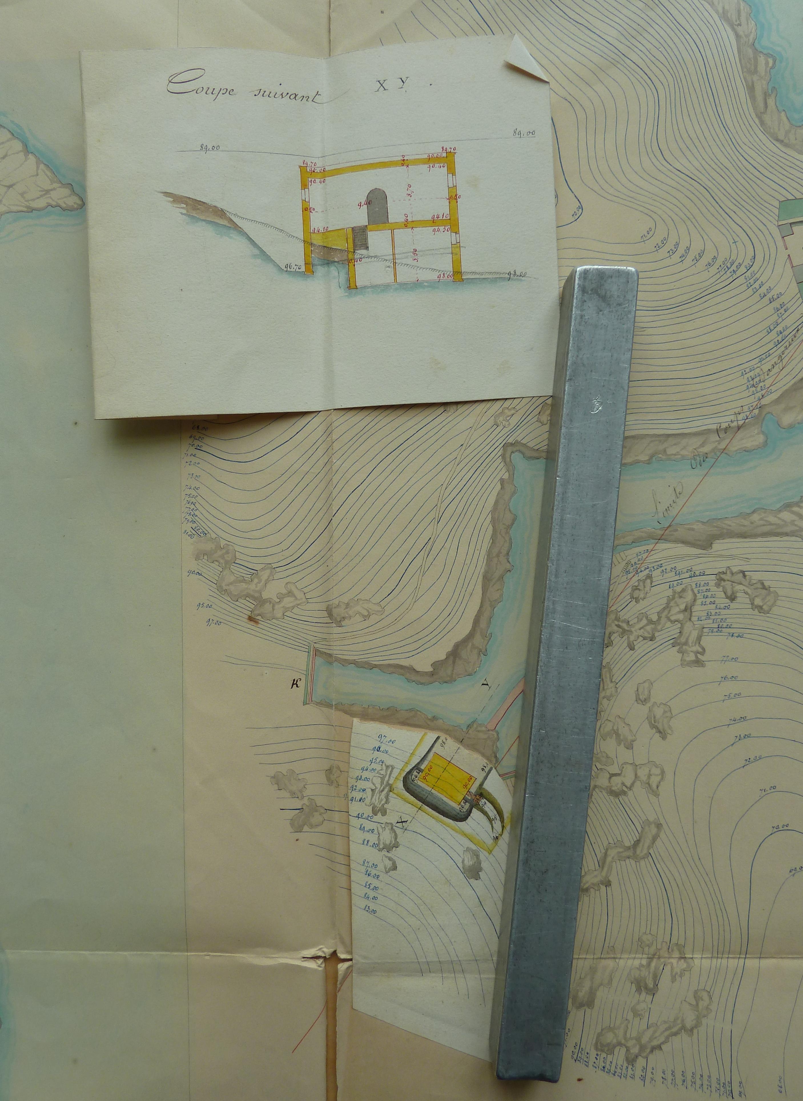 Service historique de la Défense, département Armée de Terre, Vincennes. Archives du Génie ; Article 8, Places françaises et d'Algérie : 1 VH 294, Place de Belle-Île-en-Mer, projets et dépenses annuels, 1854-1857. Direction du Génie de Brest, Place de Belle-Ile, feuille n° 10 des projets extraordinaires pour 1857-1858, batteries d'Arzic, postes garde-côtes de Port Maria et Port Andro, 19 février 1857 [papillote de correction du 18 mars 1857].