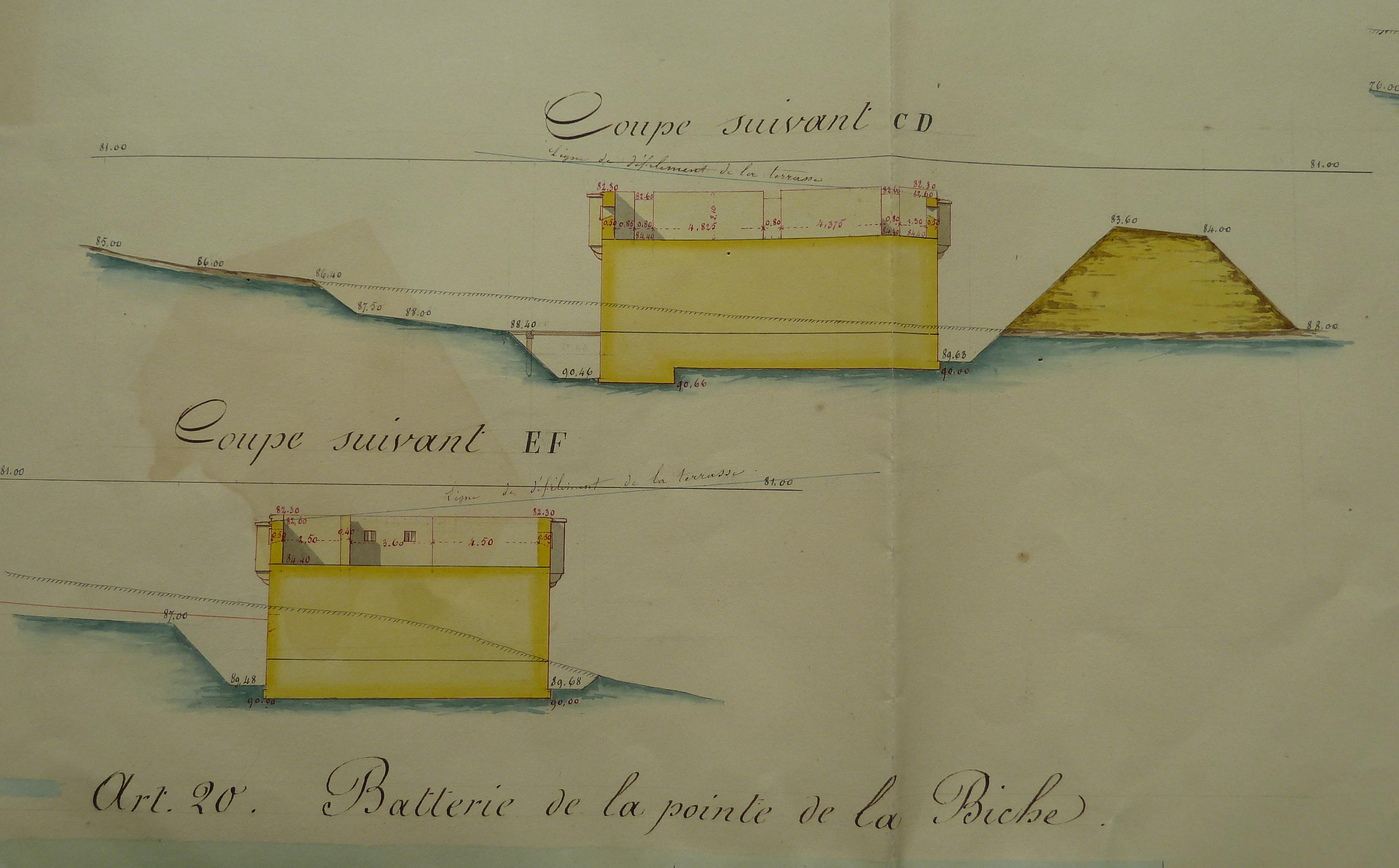 Service historique de la Défense, département Armée de Terre, Vincennes. Archives du Génie ; Article 8, Places françaises et d'Algérie : 1 VH 294, Place de Belle-Île-en-Mer, projets et dépenses annuels, 1854-1857. Direction du Génie de Brest, Place de Belle-Ile, feuille n° 11 des projets extraordinaires pour 1857-1858, batteries de Kerdonis, de La Biche et de La Ferrière, 19 février 1857 [papillote de correction du 18 mars 1857].