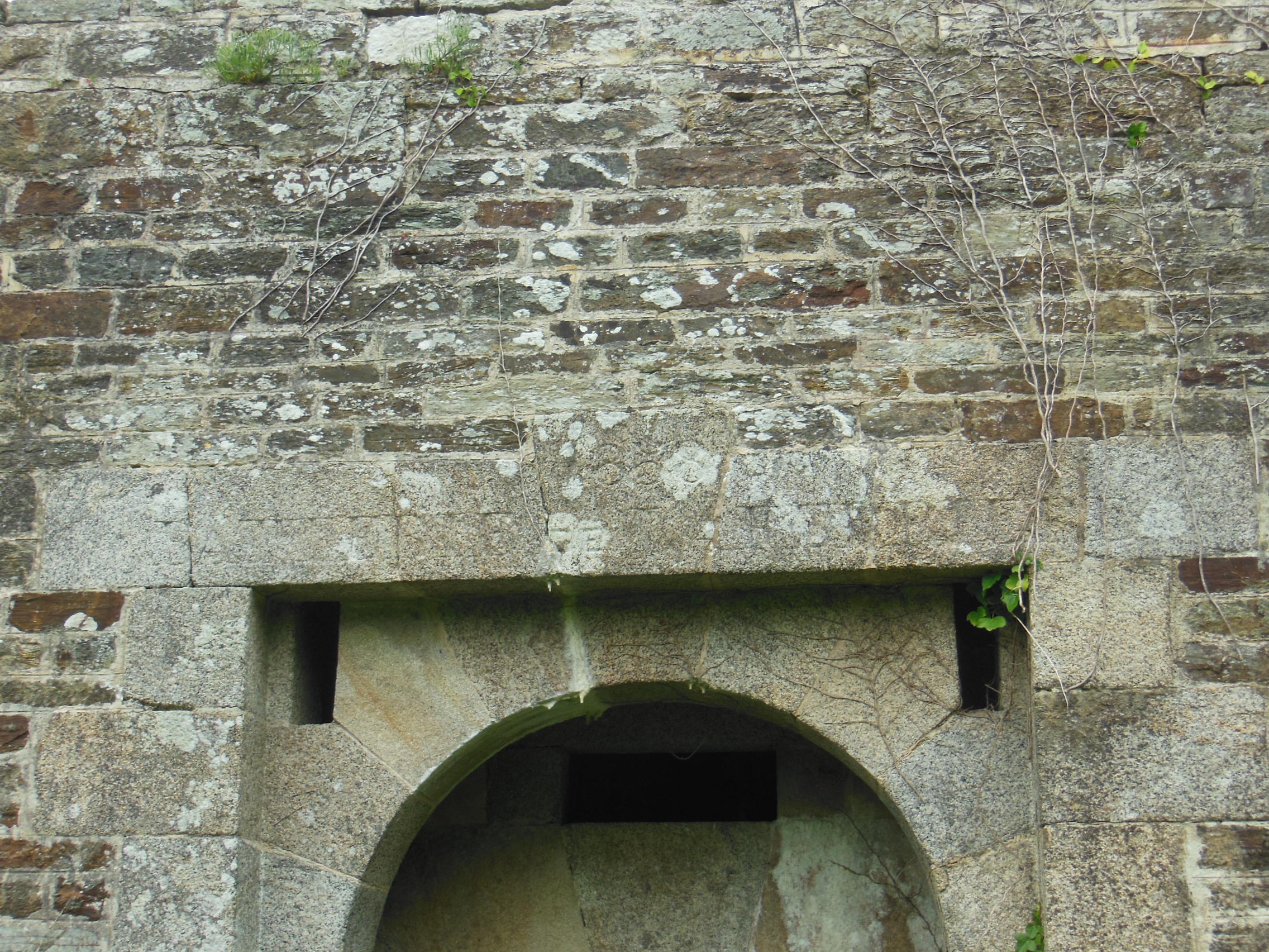 Locmaria, Grands Sables, batterie de La Ferrière, corps de garde crénelé, inscription au dessus de la porte.Immatriculation