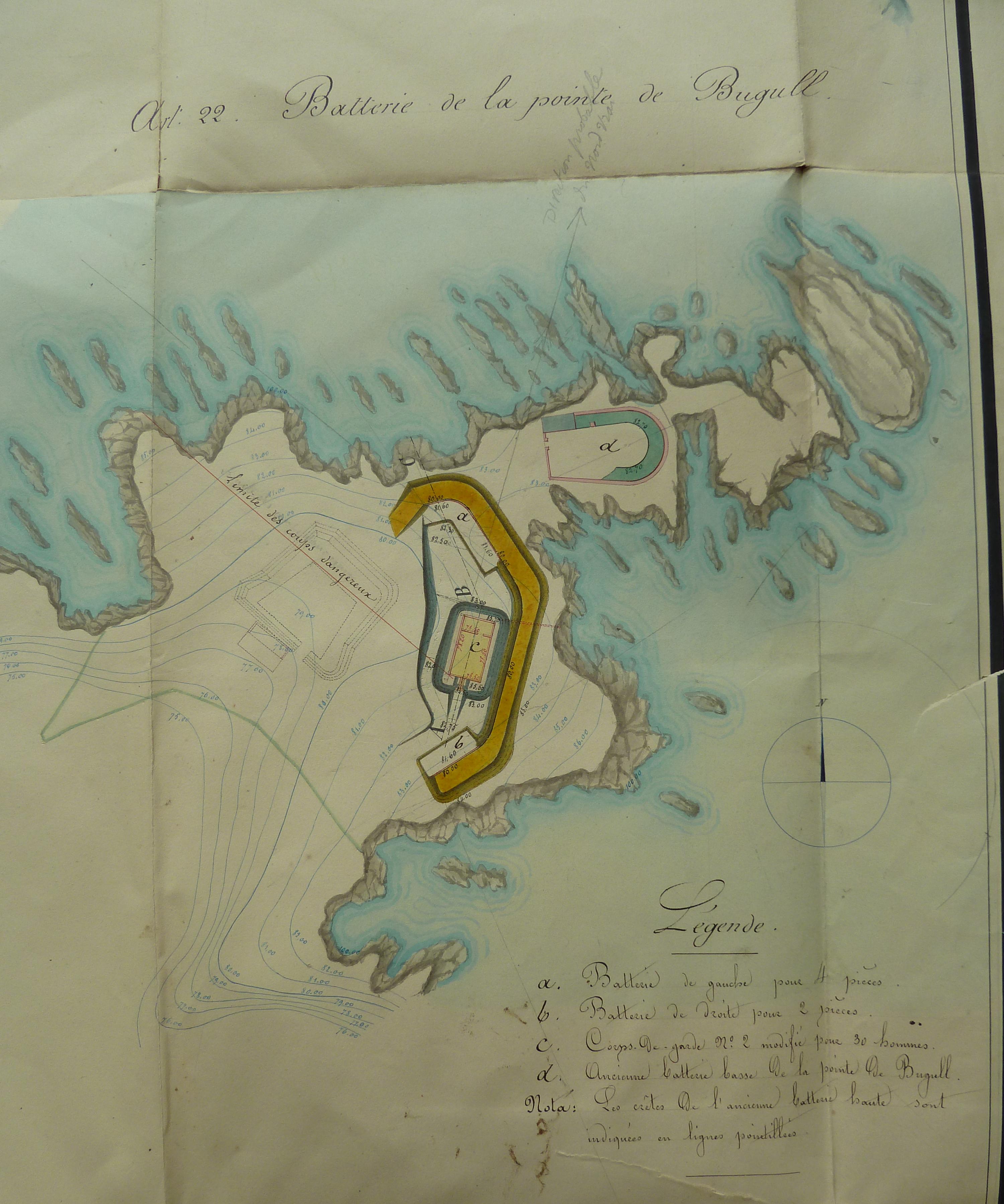 Service historique de la Défense, département Armée de Terre, Vincennes. Archives du Génie ; Article 8, Places françaises et d'Algérie : 1 VH 294, Place de Belle-Île-en-Mer, projets et dépenses annuels, 1854-1857. Direction du Génie de Brest, Place de Belle-Ile, feuille n° 12 des projets extraordinaires pour 1857, 19 février 1857 [papillote de correction du 18 mars 1857].