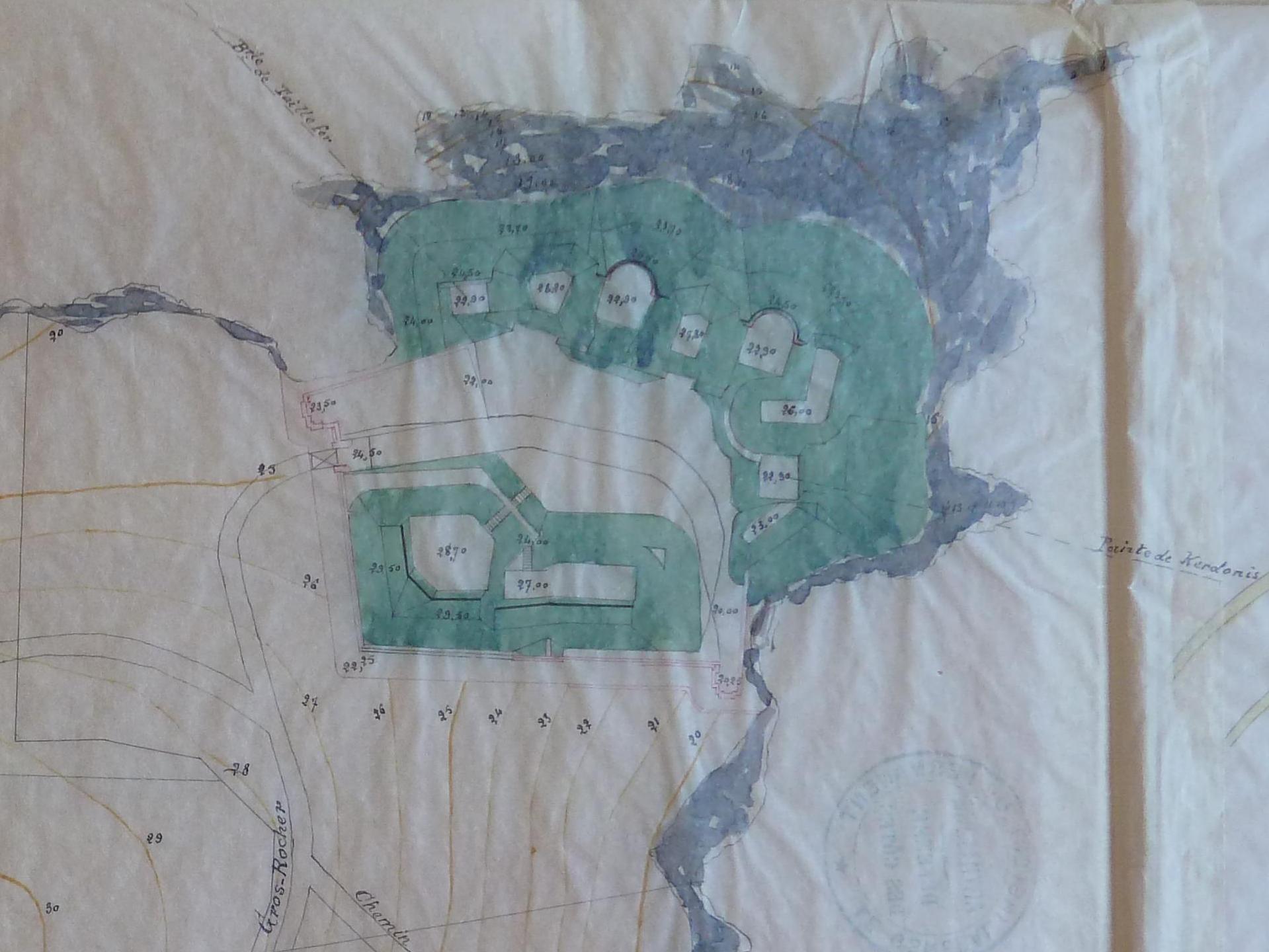 Service historique de la Défense, Département Armée de Terre, Vincennes. Archives de la Guerre, Troisième République ; Sous-série 7 N, État-major de l'Armée : 7 N 1904, Défense des fronts de mer, dossiers de l’inspection générale permanente d’armement des côtes - Atlantique : pièces collectives, Belle-Ile, Blaye, Bordeaux, Brest (1878-1912). Croquis joint à l'avis commun des Inspecteurs permanents au sujet de la réorganisation des batteries de côte de Belle-Ile, 23 mai 1891.