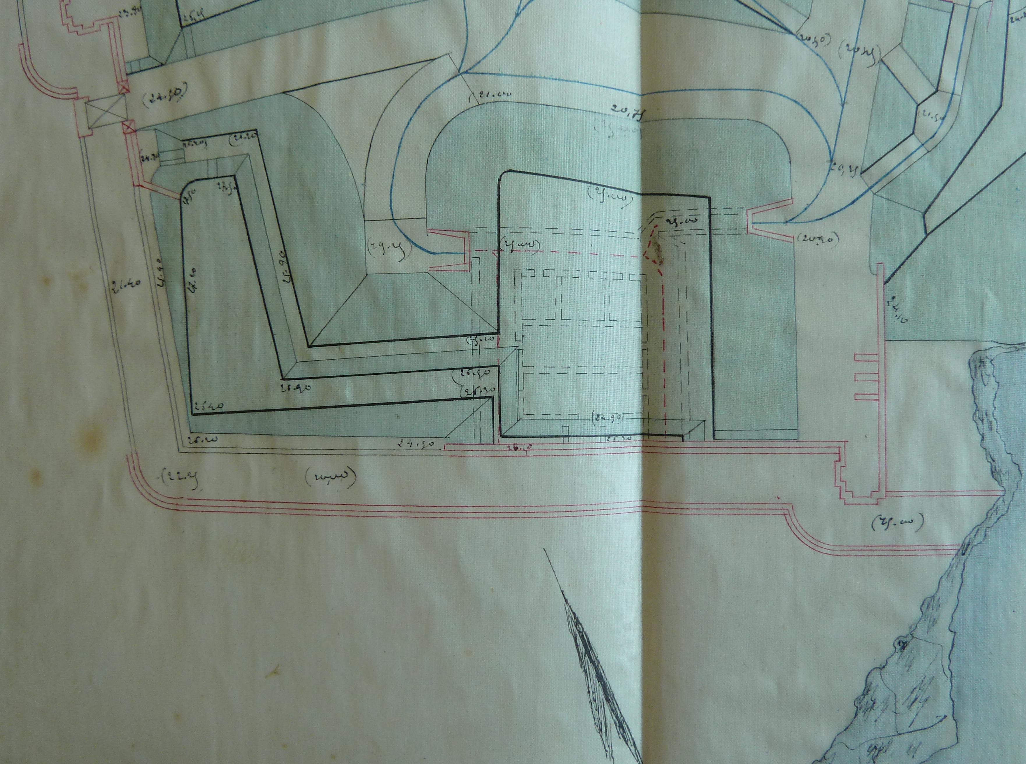 Service historique de la Défense, Département Armée de Terre, Vincennes. Archives de la Guerre, Troisième République ; Sous-série 7 N, État-major de l'Armée : 7 N 1904, Défense des fronts de mer, dossiers de l’inspection générale permanente d’armement des côtes - Atlantique : pièces collectives, Belle-Ile, Blaye, Bordeaux, Brest (1878-1912). Croquis joint au procès-verbal de conférence en date du 30 décembre 1894 relatif à l'emmagasinement des munitions dans les batteries de côte de Belle-Ile.