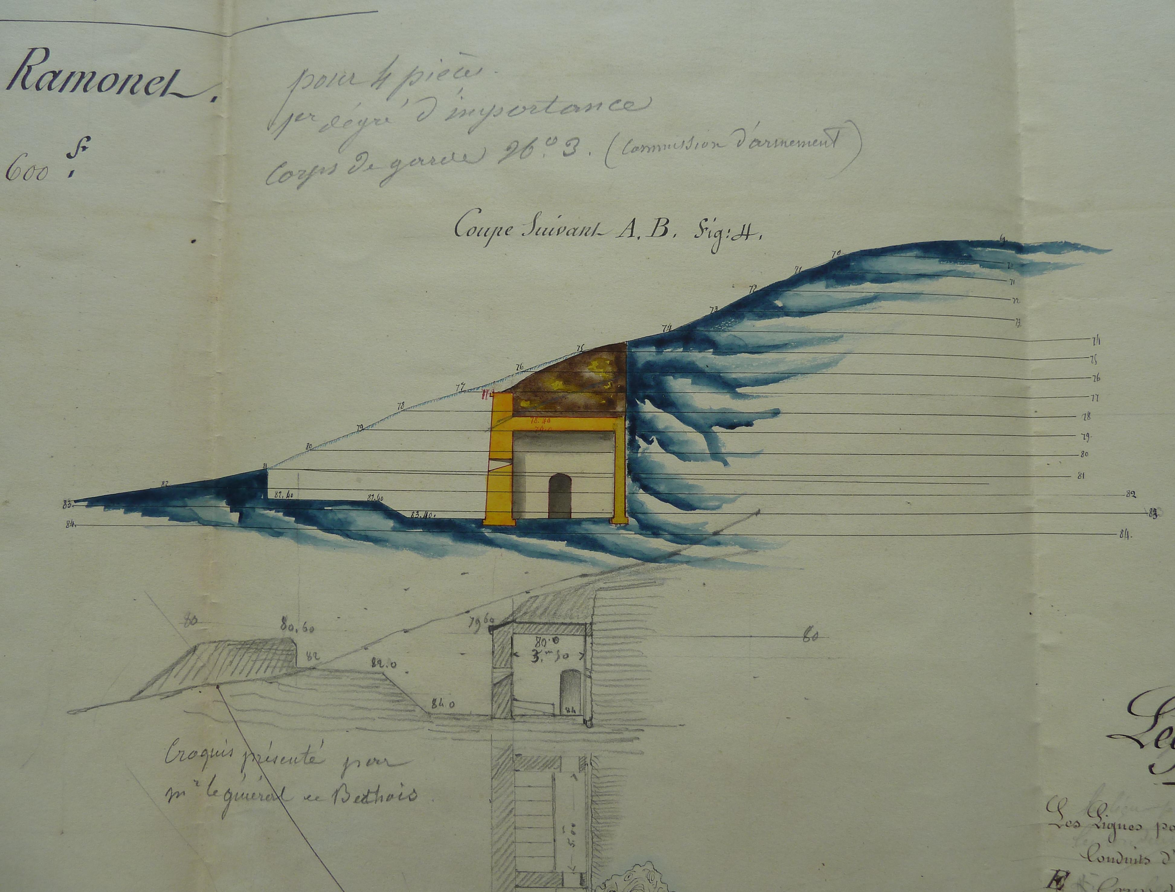 Service historique de la Défense, département Armée de Terre, Vincennes. Archives du Génie ; Article 8, Places françaises et d'Algérie : 1 VH 292, Place de Belle-Île-en-Mer, projets et dépenses annuels, 1847. Direction du Génie de Nantes, Place de Belle-Ile, feuille n° 15 des projets extraordinaires pour 1847, établissement d'une batterie à Ramonet, 14 janvier 1847.