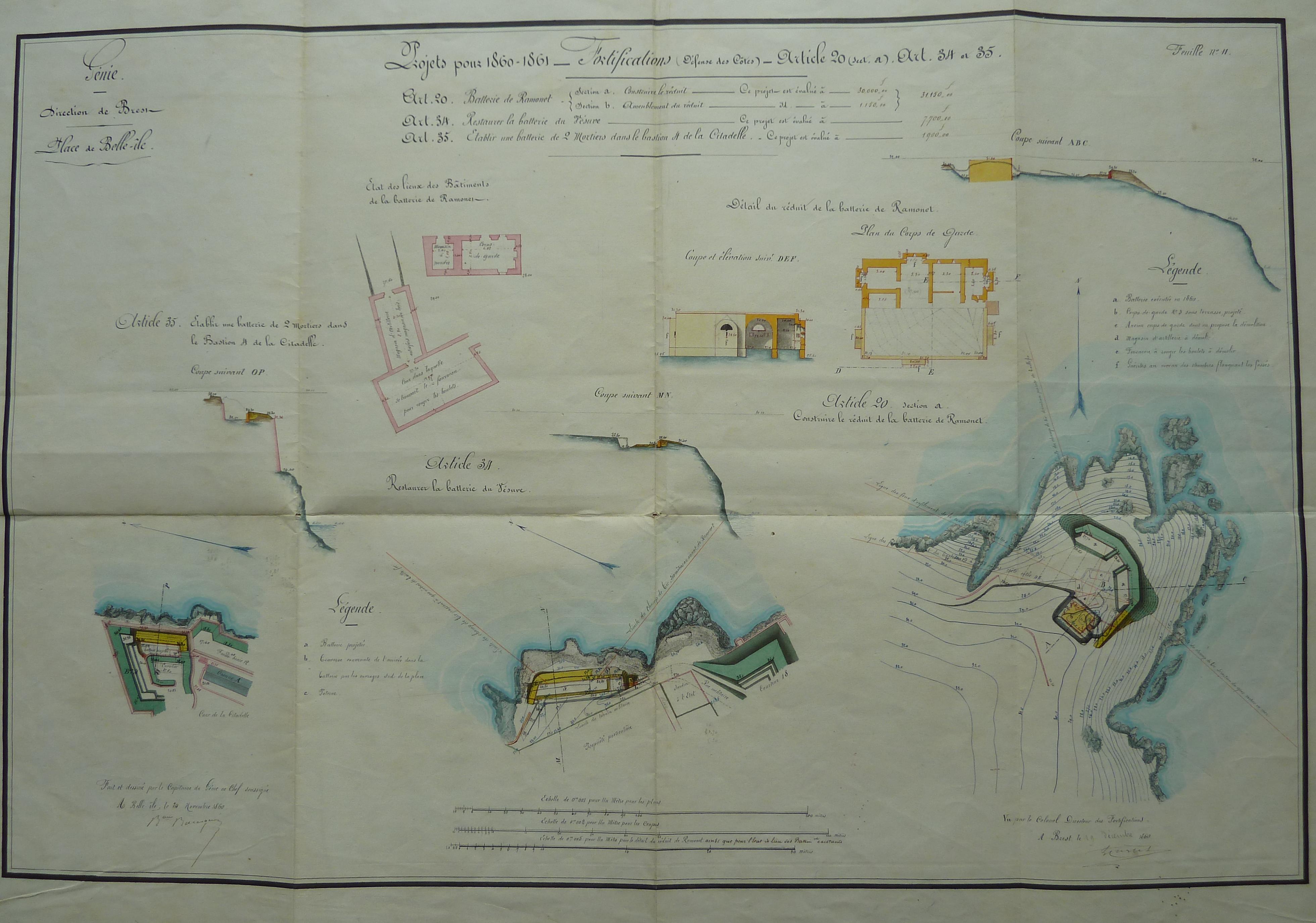 Service historique de la Défense, département Armée de Terre, Vincennes. Archives du Génie ; Article 8, Places françaises et d'Algérie : 1 VH 296, Place de Belle-Île-en-Mer, projets et dépenses annuels, 1860-1861. Direction du Génie de Brest, Place de Belle-Ile, feuille n° 11 des projets supplémentaires pour 1860-1861, batterie de Ramonet, batterie du Vésuve, bastion 4 de la citadelle, 24 novembre 1860.