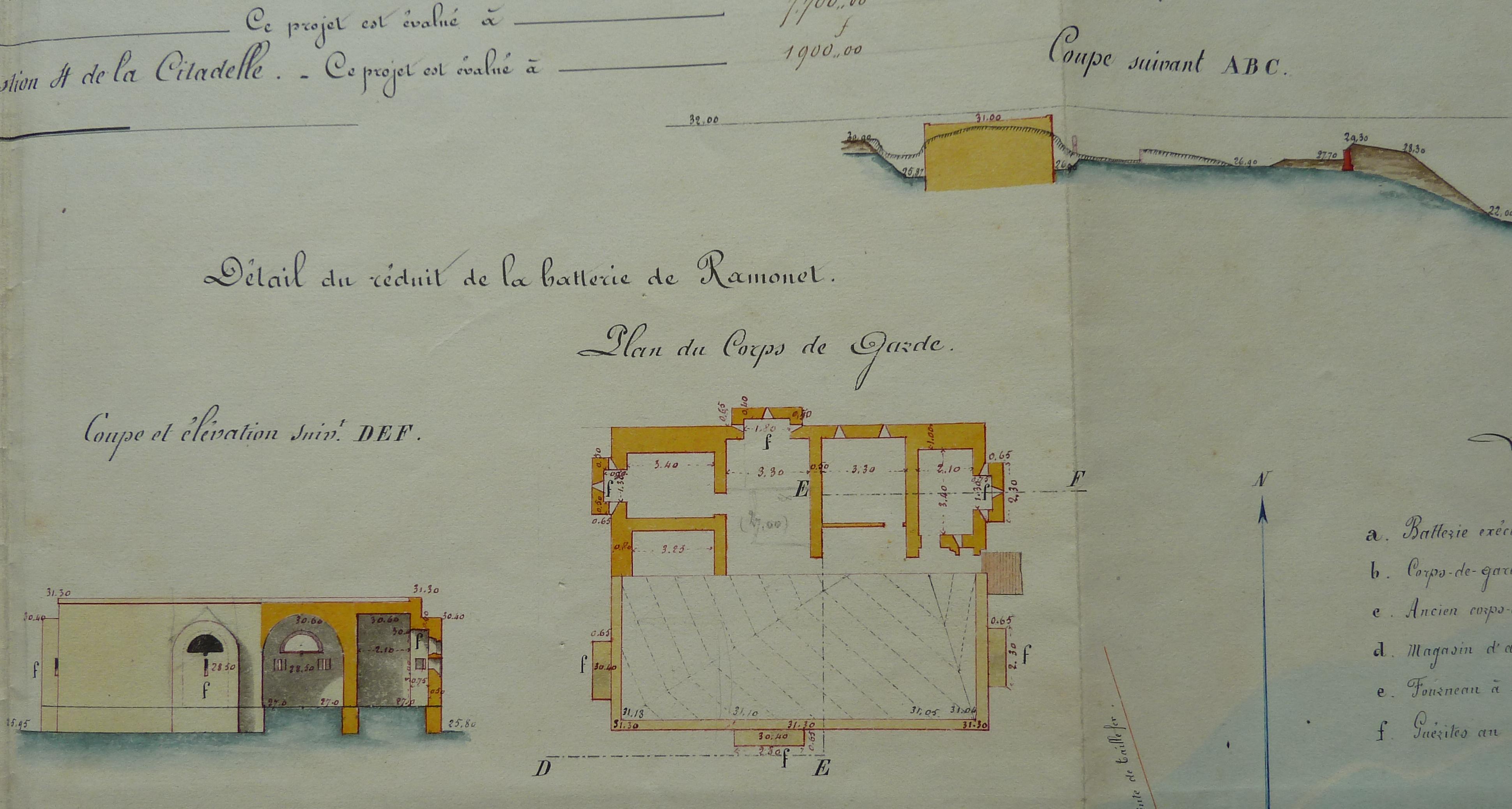 Service historique de la Défense, département Armée de Terre, Vincennes. Archives du Génie ; Article 8, Places françaises et d'Algérie : 1 VH 296, Place de Belle-Île-en-Mer, projets et dépenses annuels, 1860-1861. Direction du Génie de Brest, Place de Belle-Ile, feuille n° 11 des projets supplémentaires pour 1860-1861, batterie de Ramonet, batterie du Vésuve, bastion 4 de la citadelle, 24 novembre 1860.