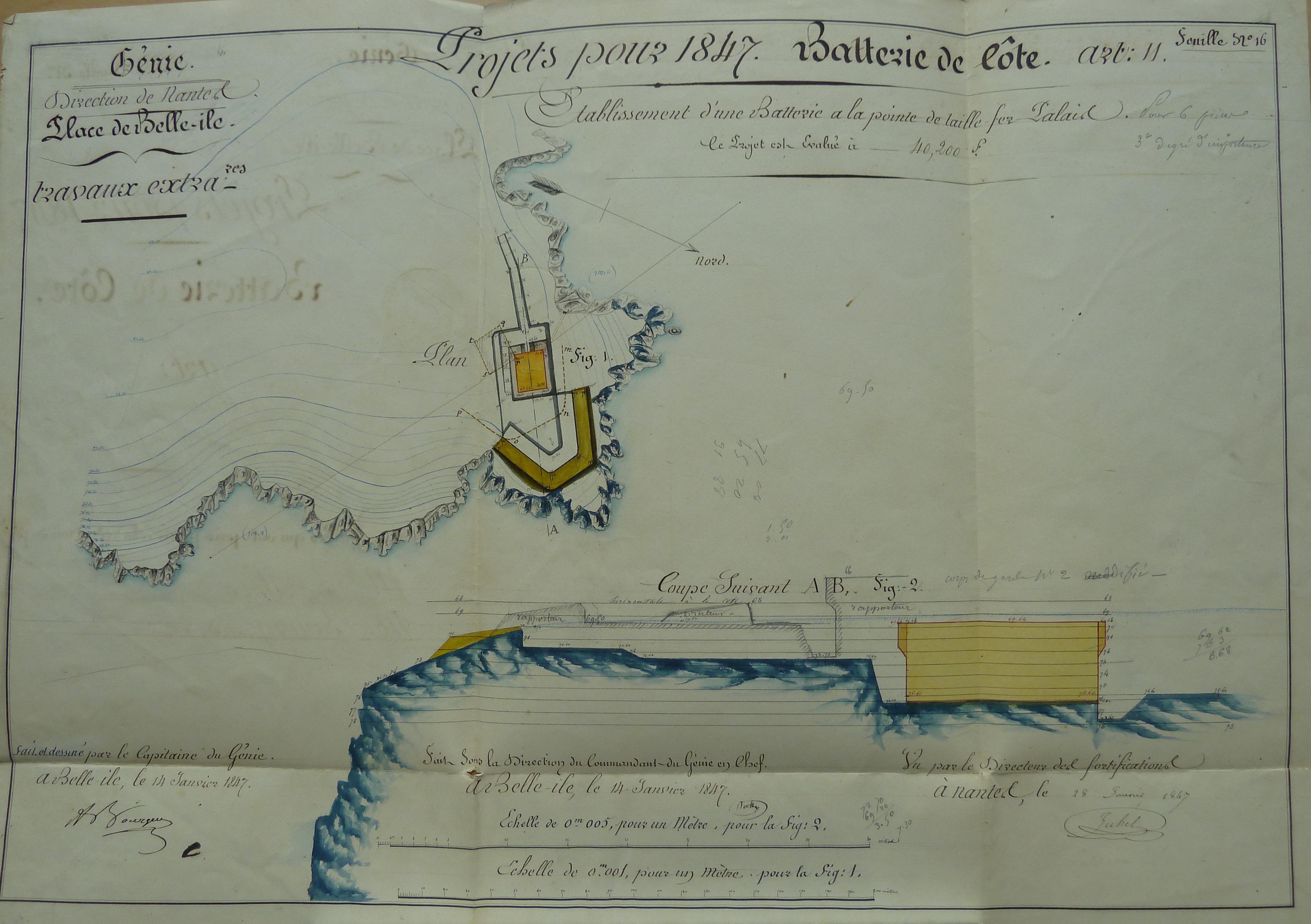 Service historique de la Défense, département Armée de Terre, Vincennes. Archives du Génie ; Article 8, Places françaises et d'Algérie : 1 VH 292, Place de Belle-Île-en-Mer, projets et dépenses annuels, 1847. Direction du Génie de Nantes, Place de Belle-Ile, feuille n° 16 des projets extraordinaires pour 1847, établissement d'une batterie à la pointe de Taillefer, 14 janvier 1847.