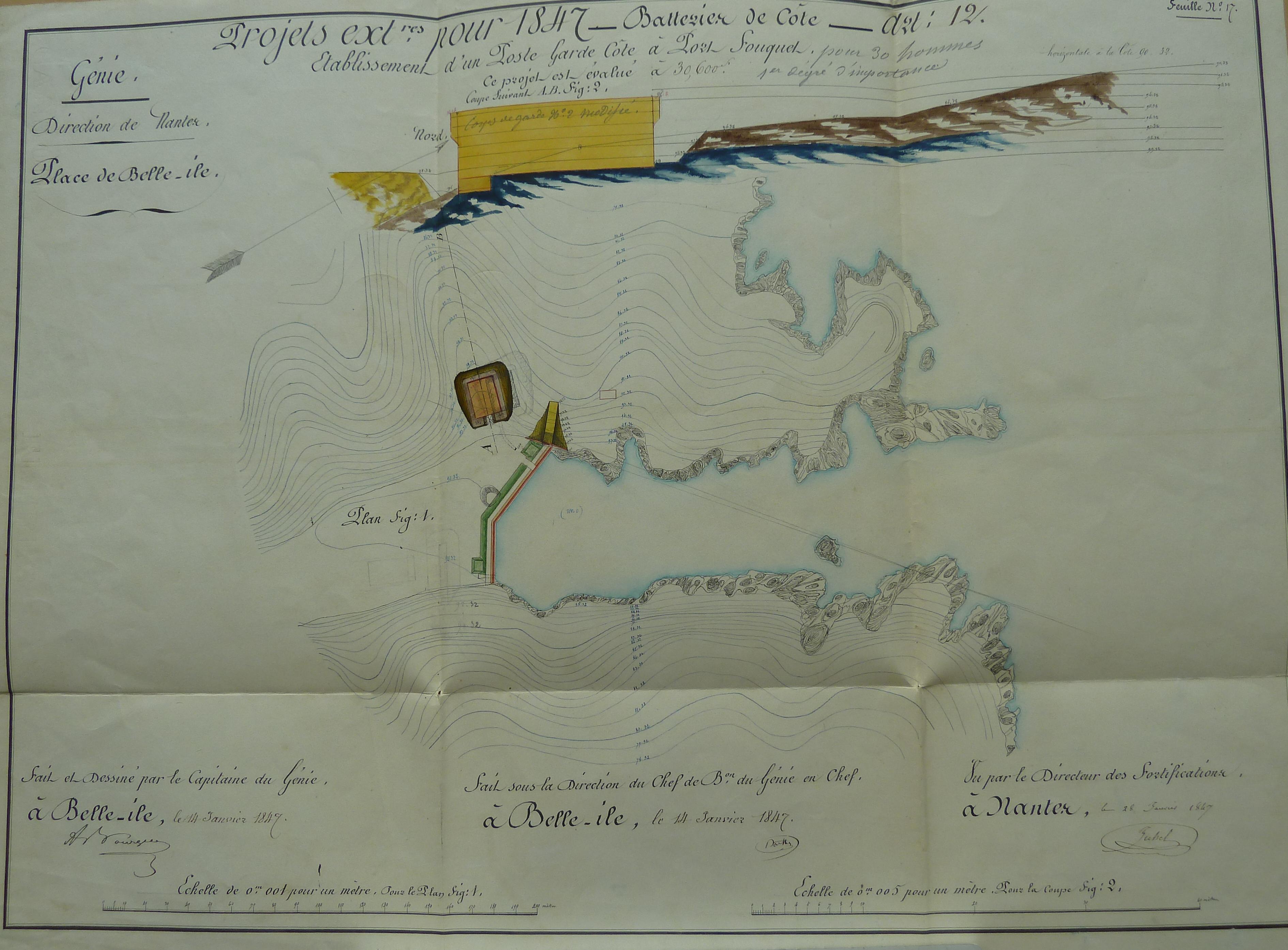 Service historique de la Défense, département Armée de Terre, Vincennes. Archives du Génie ; Article 8, Places françaises et d'Algérie : 1 VH 292, Place de Belle-Île-en-Mer, projets et dépenses annuels, 1847. Direction du Génie de Nantes, Place de Belle-Ile, feuille n° 17 des projets extraordinaires pour 1847, établissement d'un poste garde-côte à Port Fouquet, 14 janvier 1847.