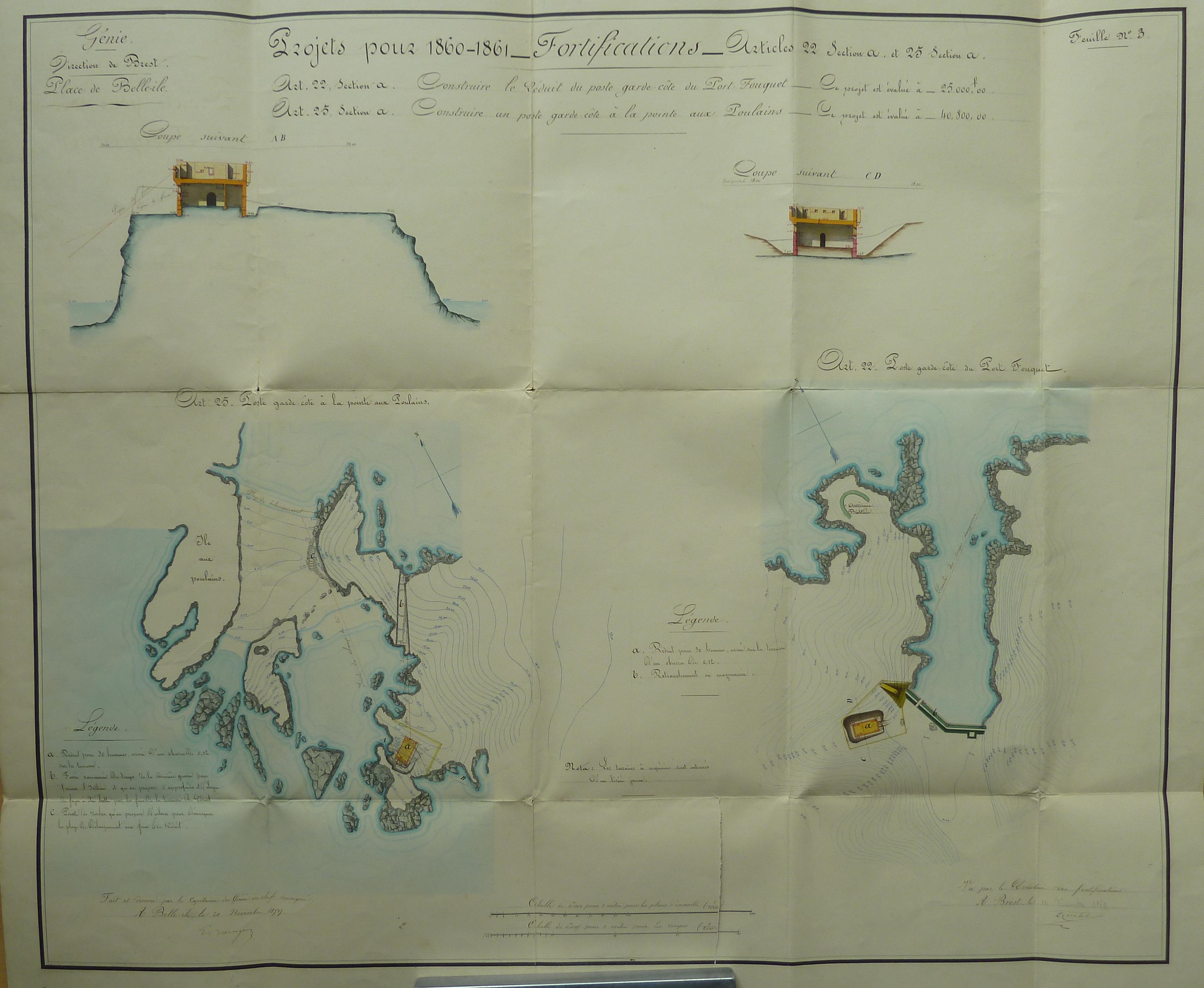Service historique de la Défense, département Armée de Terre, Vincennes. Archives du Génie ; Article 8, Places françaises et d'Algérie : 1 VH 292, Place de Belle-Île-en-Mer, projets et dépenses annuels, 1847. Direction du Génie de Brest, Place de Belle-Ile, feuille n° 3 des projets extraordinaires pour 1860-1861, postes garde-côtes du Port Fouquet et de la pointe aux Poulains, 20 novembre 1859.