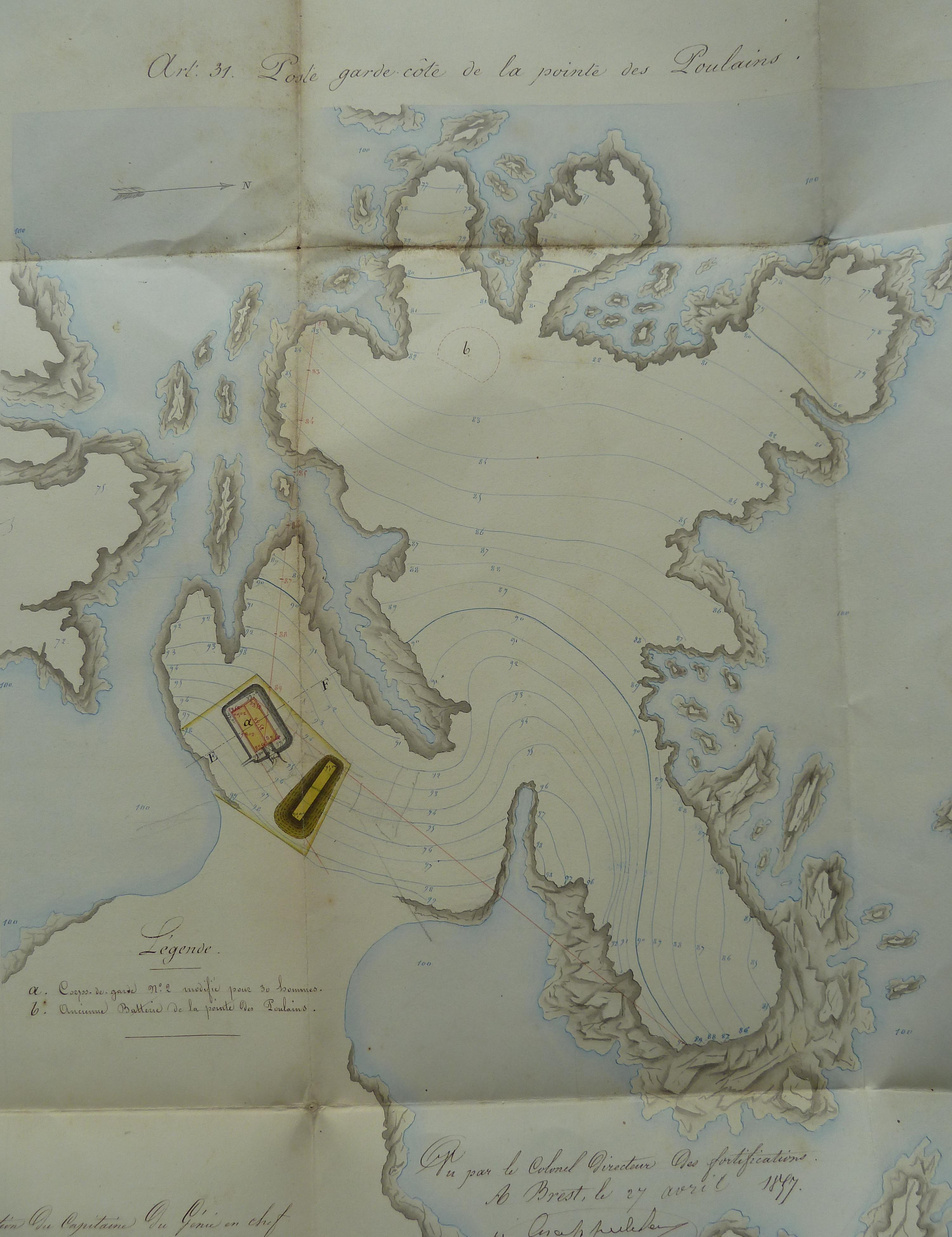 Service historique de la Défense, département Armée de Terre, Vincennes. Archives du Génie ; Article 8, Places françaises et d'Algérie : 1 VH 294, Place de Belle-Île-en-Mer, projets et dépenses annuels, 1854-1857. Direction du Génie de Brest, Place de Belle-Ile, feuille n° 16 des projets extraordinaires pour 1857-1858, postes garde-côtes de la pointe aux Poulains, du Vieux Château et de Pouldon, 19 février 1857.