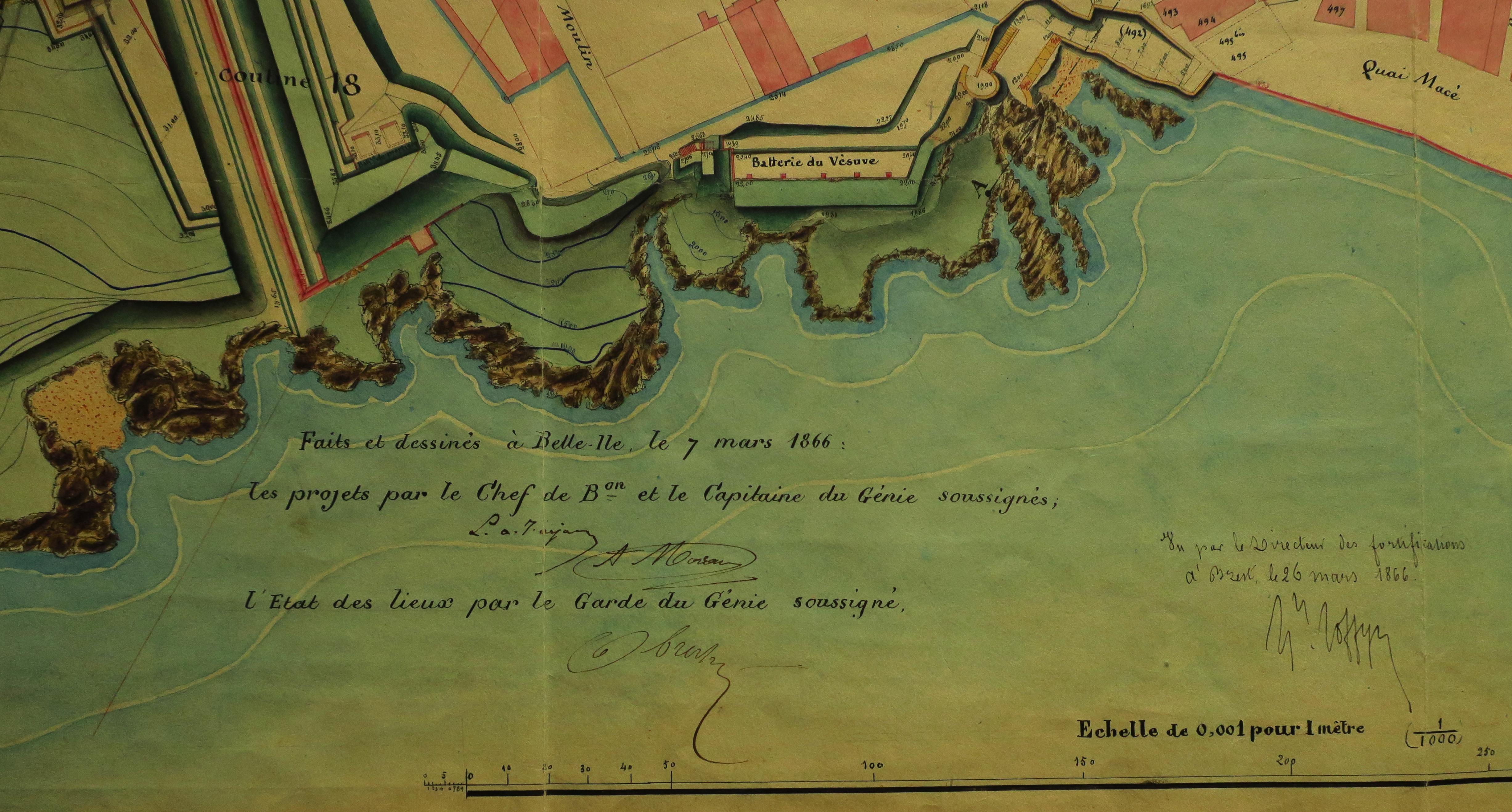 Service historique de la Défense, département Armée de Terre, Vincennes. Archives du Génie ; Article 8, Places françaises et d'Algérie : 1 VH 297, Place de Belle-Île-en-Mer, projets et dépenses annuels, 1862-1875. Direction du Génie de Brest, Place de Belle-Ile, feuille n° 2 des projets pour 1866-1867, 7 mars 1866.